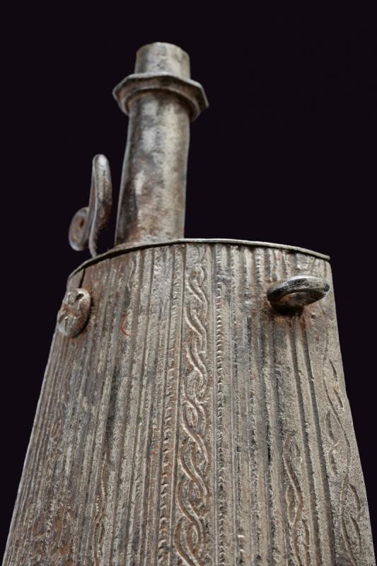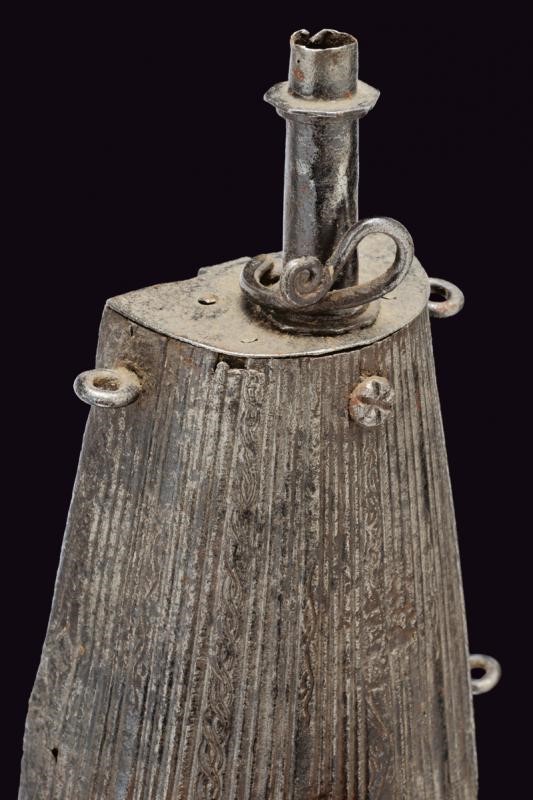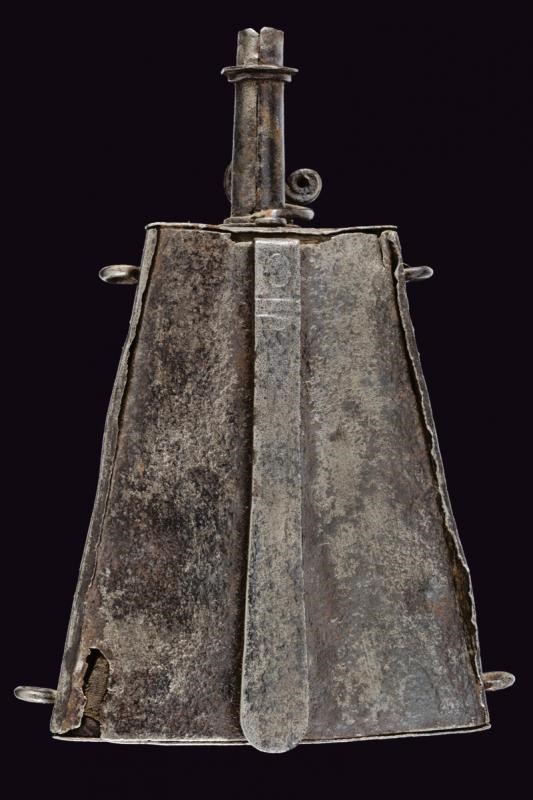 In ferro. Con serbatoio di forma quasi troncoconica, piatto sul retro e fortemente convesso sul lato anteriore la cui superficie è anche ornata a scanalature longitudinali e con resti di cornicette a volute e racemi. Quattro campanelle di sospensione. Il cannello cilindrico, con anellature e con chiusura dotata di molla ancora funzionante. Sul retro il gancio da cintura.