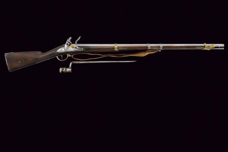 Canna tonda liscia, con culatta ottagonale, dotata di dente d'innesto per baionetta, cal. 17,7 mm. in volata. Batteria con cartella marcata "M.re Imp.le de Tulle" e punzonata con "C" sormontata da stella. Meccanica funzionante. Cassa intera in legno con qualche difetto e fori di tarlo, lievi mancanze al fondo della pala, riparazioni anche all'astina. La guancia destra con bollo "EF" datato 1813 e recante timbro "C" sormontato da stella. Fornimenti in ottone, il reggicanna centrale in ferro. Ponticello in ottone e ferro. Bocchino con mirino. Bacchetta in ferro. Cinghia in cuoio sbiancato. Con una baionetta a ghiera.
