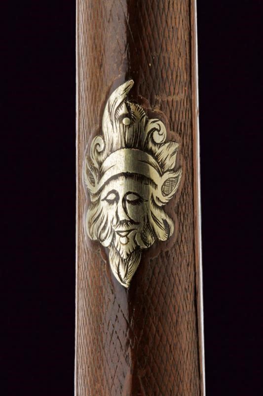 Canna liscia a due ordini; la prima parte ottagonale, incisa con tre gigli e due stelle alla base, la seconda parte tonda con anellatura al cambio e con mirino, cal. 16 mm. Batteria ridotta a luminello finemente incisa ed intagliata, il cane a forma di pesce, la base del porta pistone con due teste di serpente. Cassa intera in legno con astina e collo zigrinati, piccoli restauri; un mascherone intagliato nella parte inferiore della pala. Fornimenti in argento, parzialmente traforati e incisi a motivi floreali. La parte posteriore del ponticello di restauro, al centro del poggiamano un mascherone, due reggicanna decorati con uccelli. Bacchetta in ferro con battipalla in corno con dischi in metallo alle estremità.