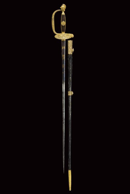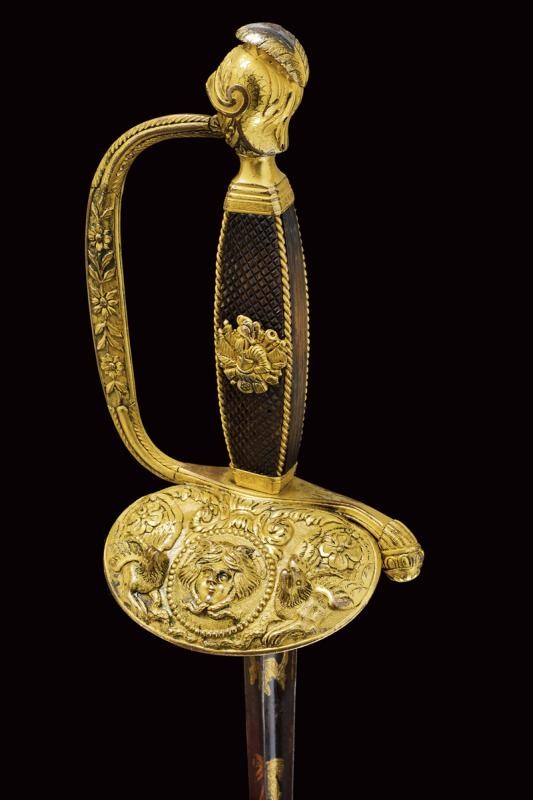 Lama di sezione triangolare con facce incavate; la prima parte incisa e dorata su fondo blu trofei e a motivi floreali. Bellissimo fornimento in bronzo dorato (piccole abrasioni), la pelta con testa di medusa in rilievo tra due leoni alati e con serpente sotto decorazioni floreali. Braccio dell'elso e ramo di guardia ornati a motivi floreali in bassorilievo, pomo a elmo. Impugnatura in corno zigrinato e scanalato con doghe agli angoli, la parte anteriore con trofeo che reca la croce sabauda al centro. Fodero in legno rivestito con pelle (piccoli danni e mancanze) e con fornimenti in bronzo dorato inciso a rocaille. Due anelli di sospensione. Probabilmente arma di un generale piemontese d'artiglieria vista la croce sabauda sull'impugnatura e la testa di medusa sulla pelta.