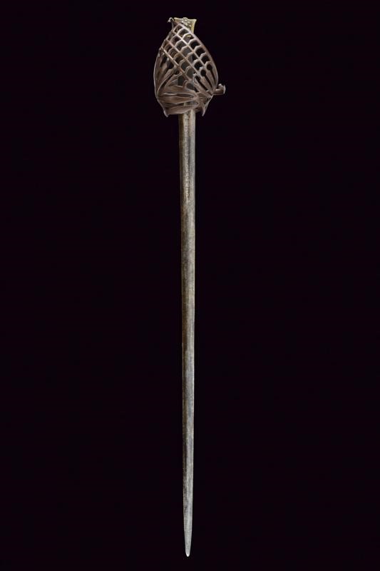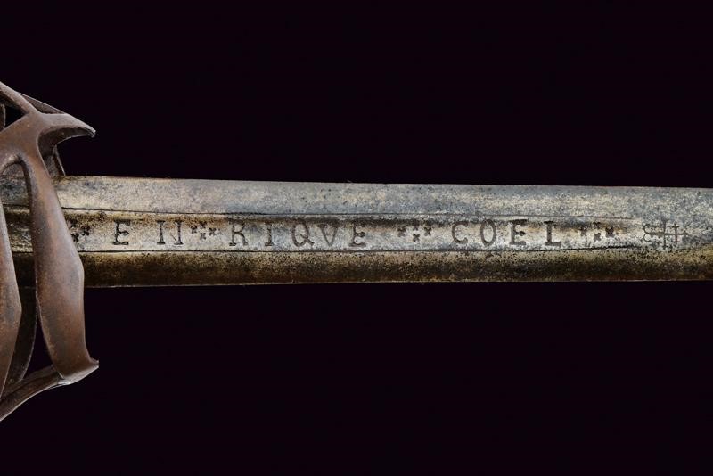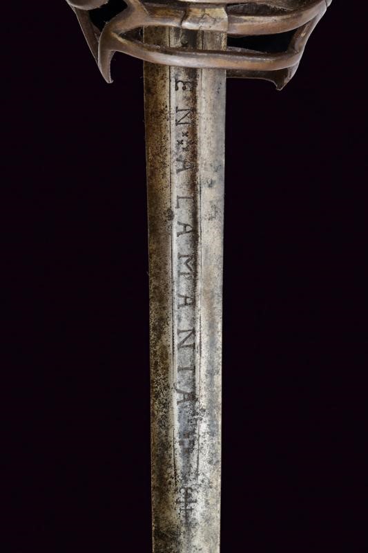 Lama dritta a due fili di sezione lenticolare; la prima parte con sguscio centrale recante sul lato di terza l'iscrizione "EN RIQWE COEL" suddivisa da quattro croci e, sull'altro lato, "EN ALAMANIA". Tipico fornimento in ferro a gabbia, il ramo vicino al braccio dell'elso marcato con simboli cabalistici, sul lato interno l'anello da pollice, il pomo a testa di gatto in ottone. Impugnatura in legno rivestito di cuoio.