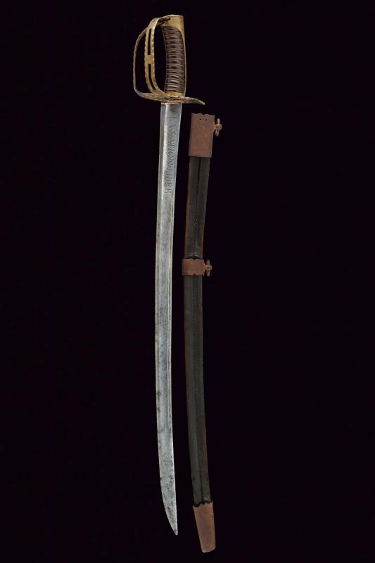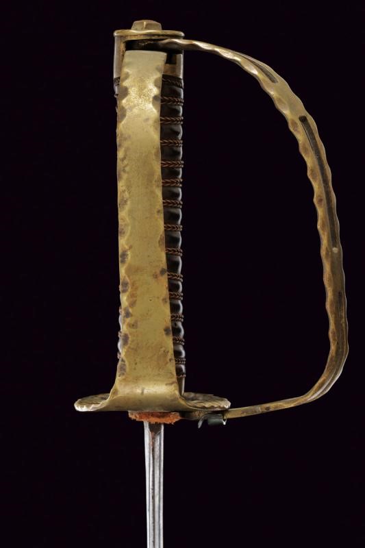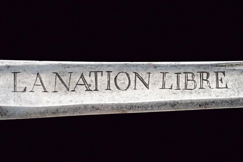 Lama quasi dritta a un filo e breve controfilo, sgusciata per quasi tutta la lunghezza e munita di sottile scanalatura accanto al dorso nel segmento centrale, recante sul lato di terza il motto "LA NATION LIBRE". Fornimento in ottone con guardia traforata e recante decoro ondulato ai bordi. Una seconda guardia è incardinata sulla prima, munita di fermo a molla in ferro per bloccarla. Cappetta lunga liscia. Impugnatura con rivestimento in manica di cuoio (qualche foro di tarlo) e con avvolgimento di trecciole in rame. Il fodero in cuoio, antico e molto consumato, parzialmente scucito, con fornimenti in ferro (in patina, una fascetta lasca) a due campanelle.