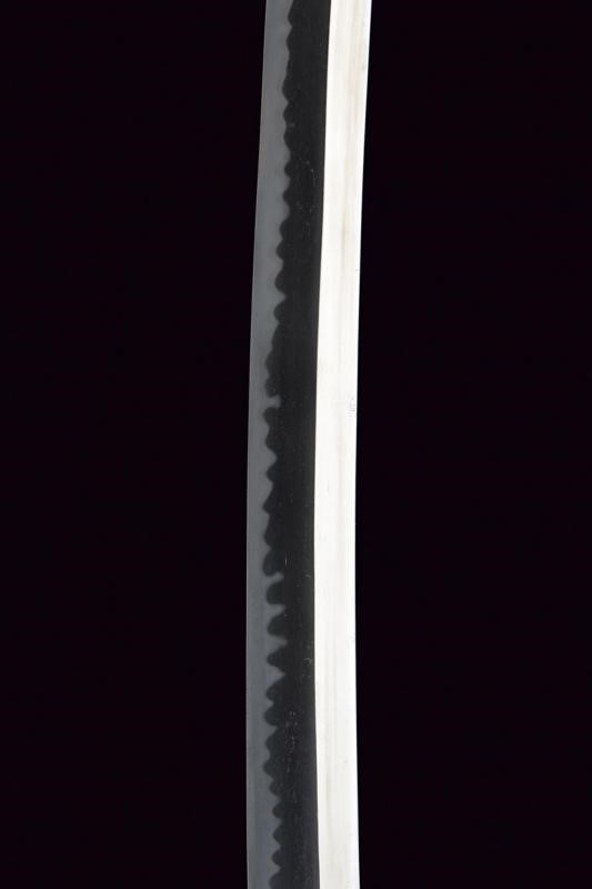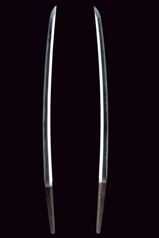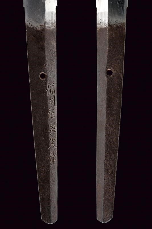 Lama Shinogi-zukuri, Iori-mune. O-kissaki. Nagasa: 69,8 cm. Hamon e hada ben visibili. Nakago-jiri: Iriyamagata. Reca scritto: Bishu ju-Sukemitsu saku (gimei, probabilmente non genuina). Un Mekugi-ana. Habaki in metallo argentato. Conservata in Shirasaya.