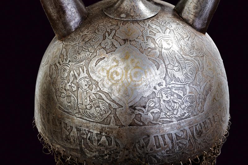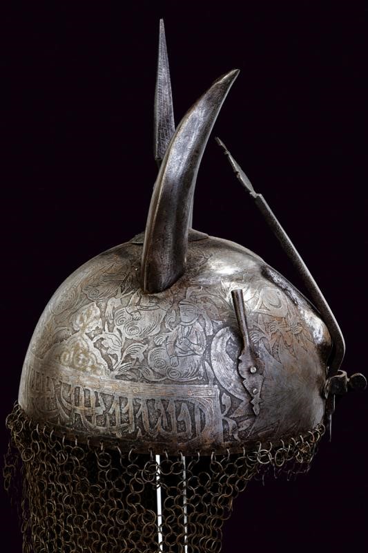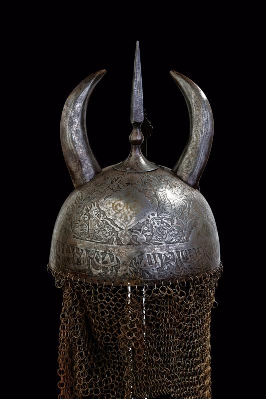 Coppo emisferico in ferro decorato con lineamenti antropomorfi in rilievo e inciso su tutta la superficie. La parte anteriore con occhi e mustacchi, i fianchi con effigi di nobiluomini e dame attorniati da cartigli con resti di agemine dorate. La banda inferiore con iscrizioni in caratteri arabi. Cuspide sommitale quadra con resti di agemine in argento, affiancata da due lunghe corna in metallo. Il nasale fisso. Due pennacchiere. Con camaglio ad anelli semplici.