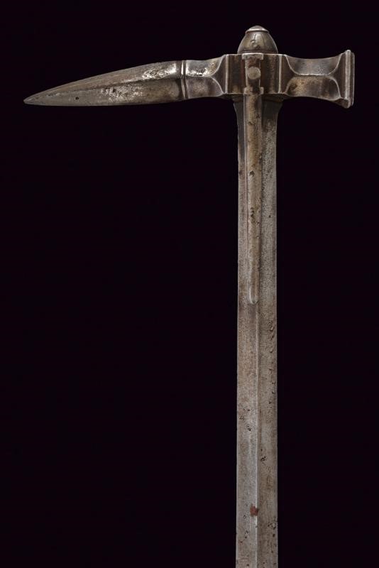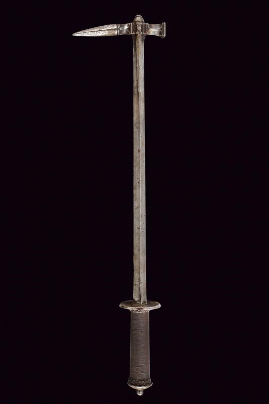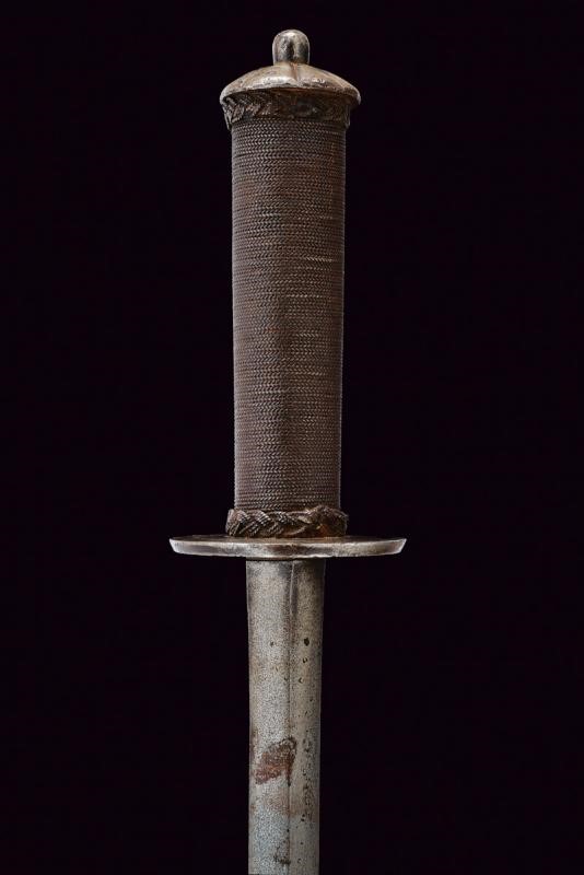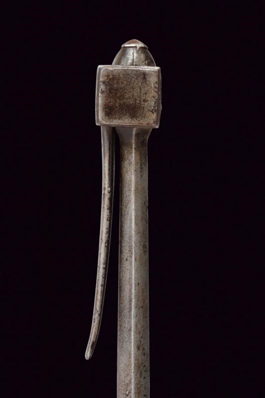 Robusta penna appuntita, di sezione quadra, leggermente obliqua, con base lievemente intagliata. Boccca piatta di forma quadra con base lavorata en suite. Fusto massiccio in ferro di sezione a losanga, munito con gancio da cintura. Impugnatura cilindrica, leggermente crescente verso il pomo, rivestita da trecciola e con teste di moro in filo di ferro (raro); la parte anteriore protetta da un elso a disco, il pomo con cappa convessa decorata a raggi e con bottone.