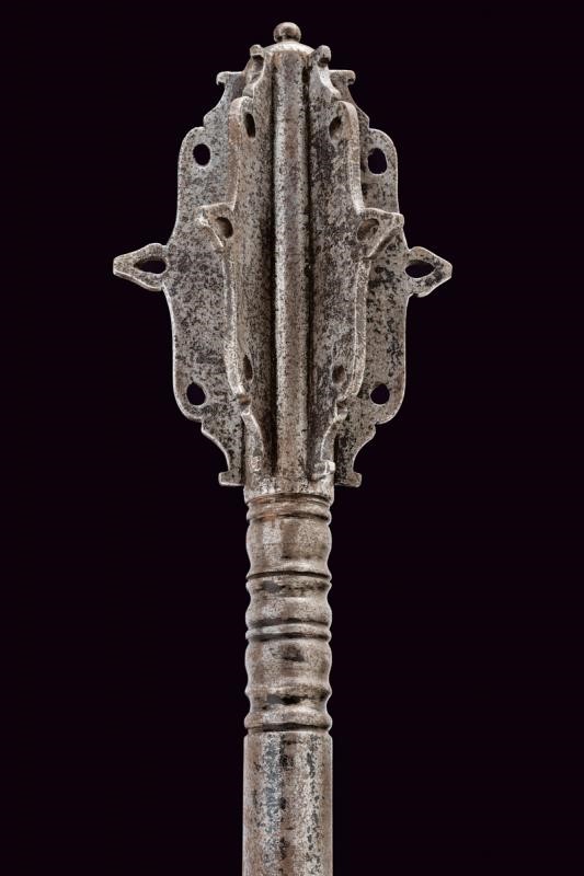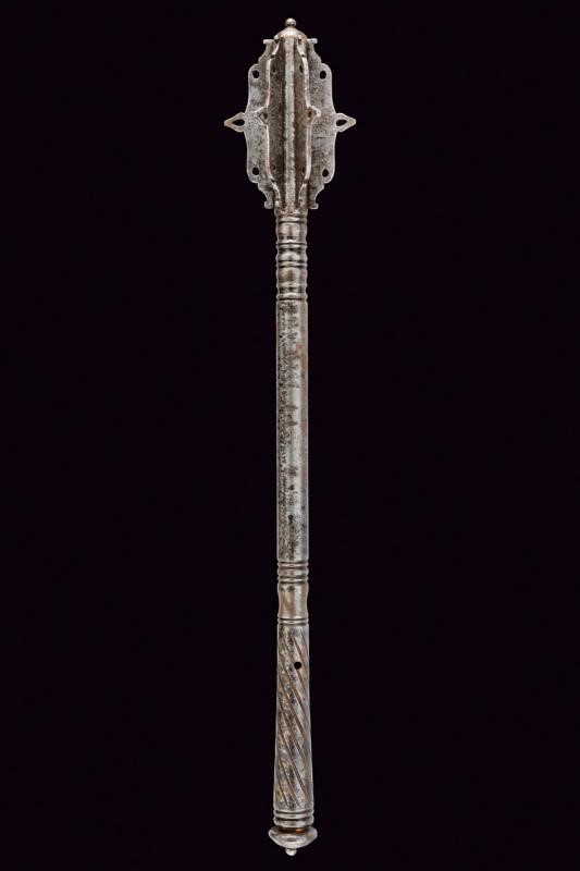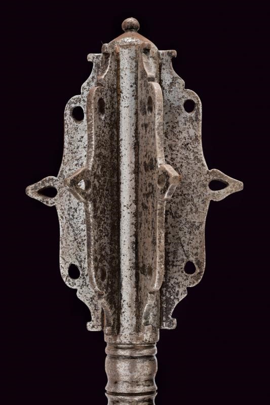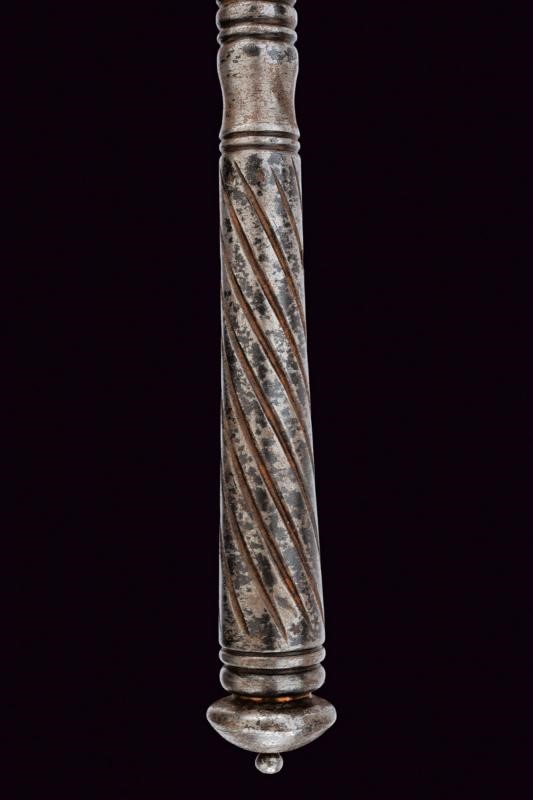 Testa a sei coste con puntale al centro e trafori, la base a balaustro. Fusto cilindrico liscio al centro e intagliato a spire all'impugnatura. Pomo lenticolare convesso con bottoncino. Foro per la corda.