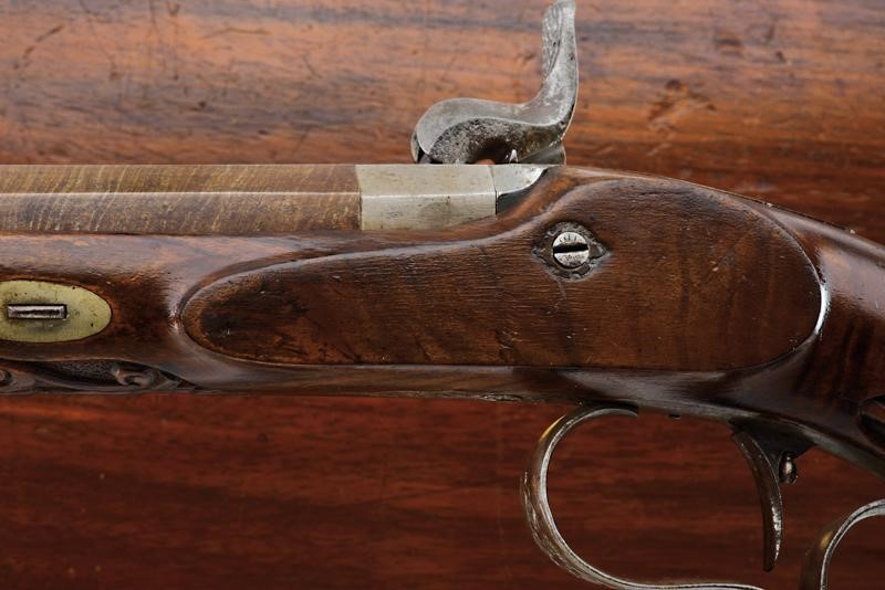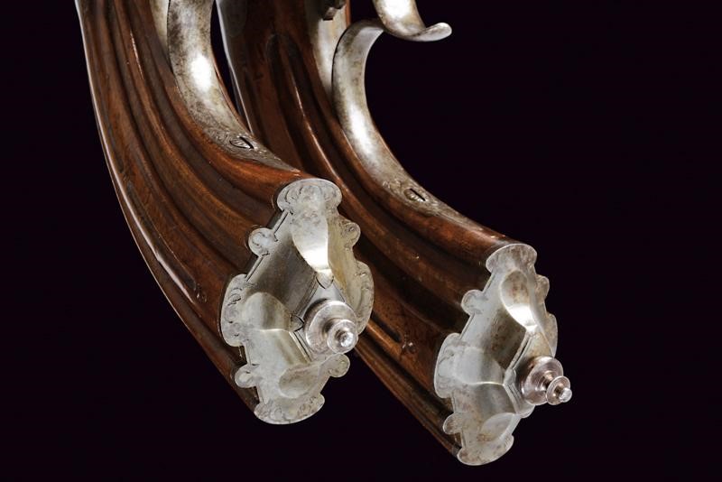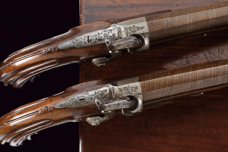 Canne rigate, ottagonali, damascate e brunite, con basi incise a motivi floreali, munite di mirino di precisione; volate di piccolo calibro (8 mm). Codette incise e dotate di traguardo. Batterie a molla in avanti finemente incise a motivi floreali. Calci a tre quarti in legno scolpiti a motivi floreali in rilievo nella parte anteriore (una con crepa) e con scanalature ai calci, al dorso marcate "1" e "2". Fornimenti in ferro decorati en suite, ponticelli con poggiadito, grilletti con stecher integrato e funzionante. In cassetta di legno foderata in panno rosso con tutti gli attrezzi.