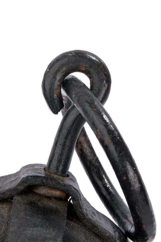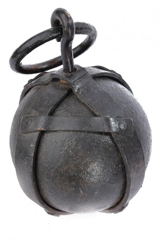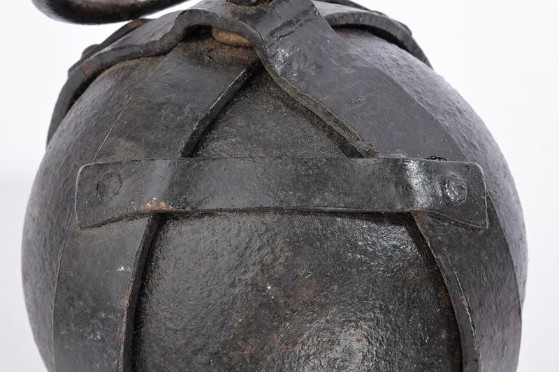 Palla sferica in ferro, tenuta da bande rivettate e munite di un grande anello. Molto rara.