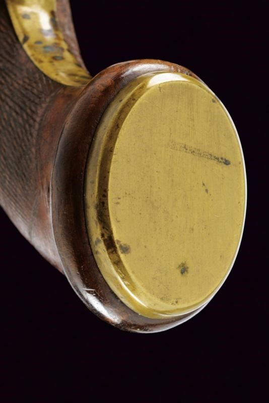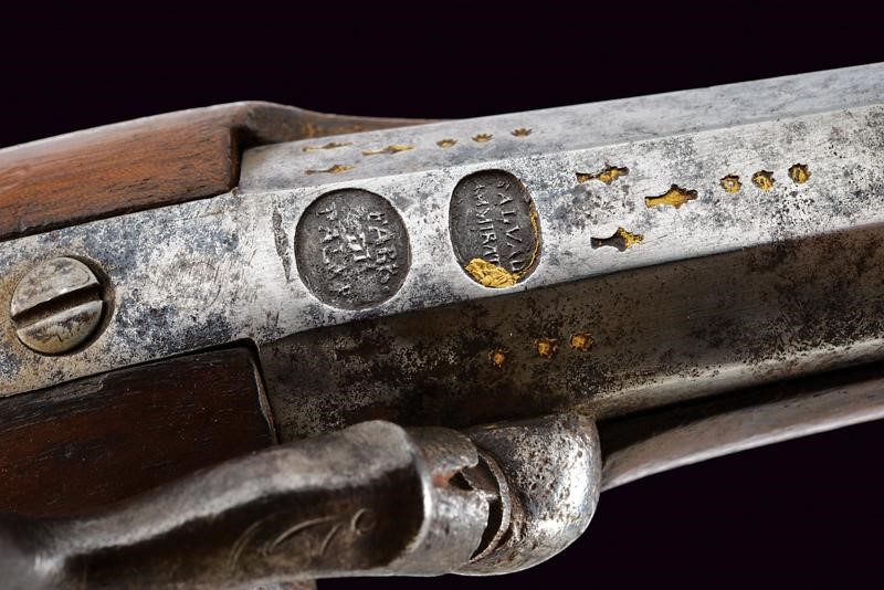 Canna liscia a due ordini; la prima parte ottagonale con due punzoni, uno marcato "SALVAD. AMMIRATO", il secondo (poco leggibile) "FABBR. DI PALERMO" entrambi circondati da gigli e fiori con resti di doratura originale. La seconda parte tonda, con un'anellature e foglie d'acanto al cambio, in cal. 16 mm. Batteria a luminello con cartella incisa a fiorame, il cane con molla esterna racchiusa in un disco con coperchio in ottone decorato en suite. Cassa intera in legno con astina e collo zigrinati, fornimenti lisci in ottone, bacchetta mancante. Meccanica da rivedere.