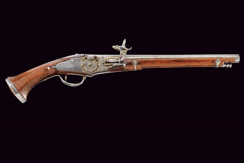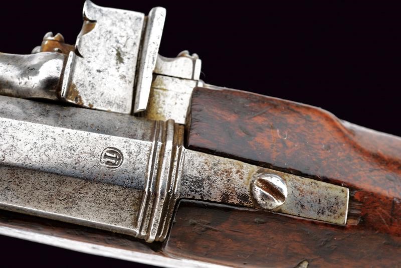 Canna liscia ottagonale, la culatta con cornice e marca, cal. 14 mm, codetta liscia. Batteria a cartella piatta con ruota esterna tenuta da briglia intagliata, il cane intagliato a motivi floreali, copriscodellino scorrevole. Cassa intera in legno con calcio faccettato e fornimenti in ferro, il ponticello inciso; bacchetta in legno con battipalla in ferro.