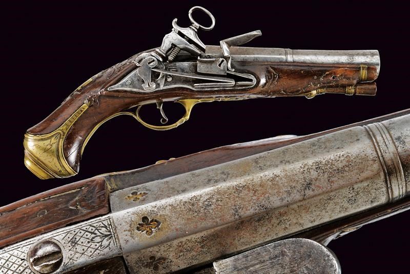 Canna liscia a due ordini; la prima parte ottagonale decorata con tre gigli con resti di doratura, la seconda parte tonda, con anellatura al cambio e con volata leggermente strombata, cal.16 mm. Codetta incisa a motivi floreali e geometrici. Batteria alla micheletta incisi a motivi floreali. Cassa intera in legno (piccoli difetti e mancanze) con fornimenti in bronzo incisi a motivi floreali, la contropiastra traforata, dorso con scudetto inciso con la testa di un guerriero. Bacchetta in legno con battipalla in corno.