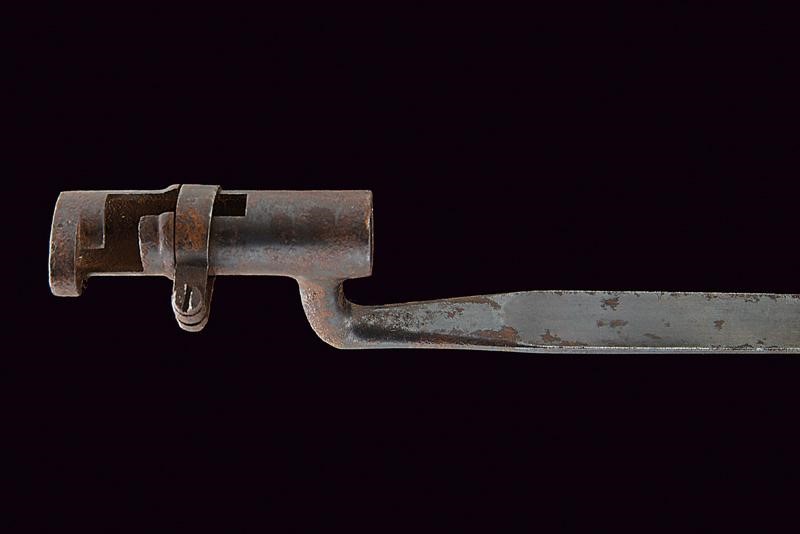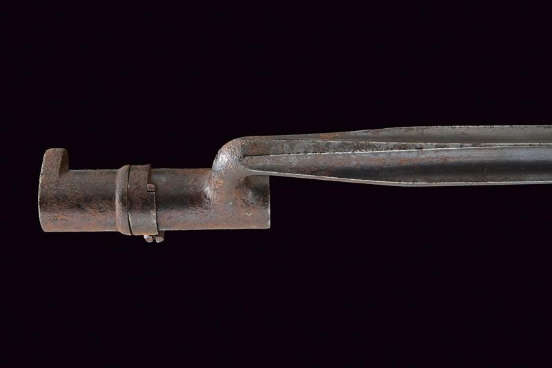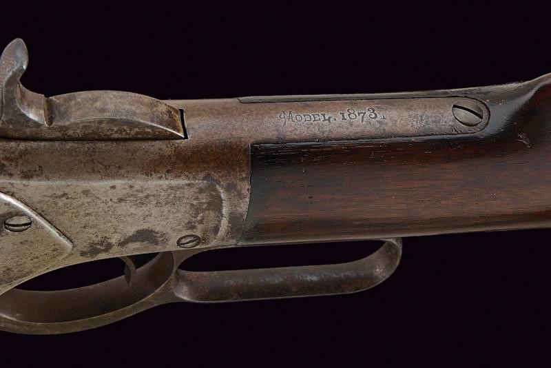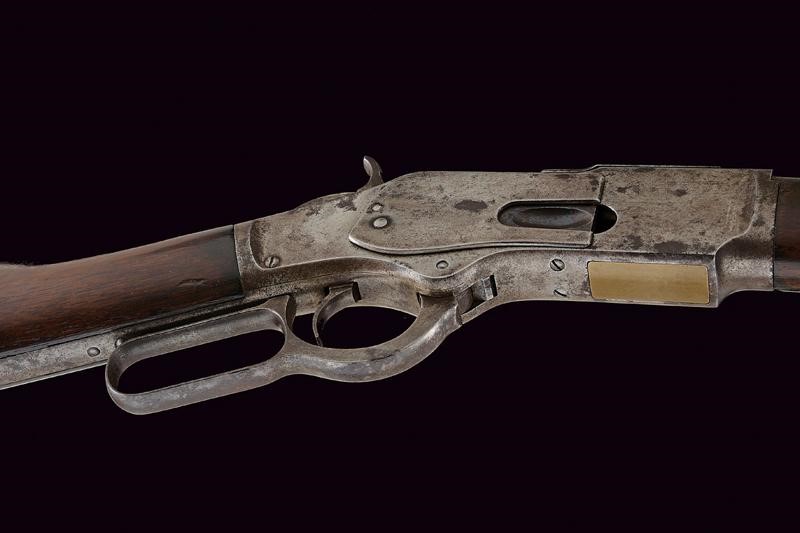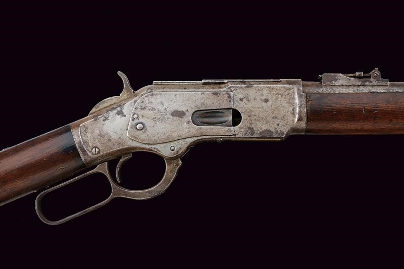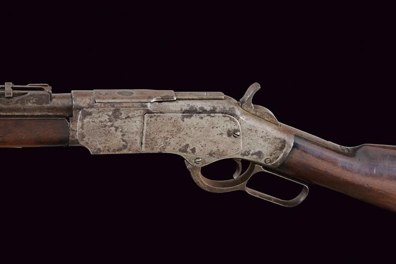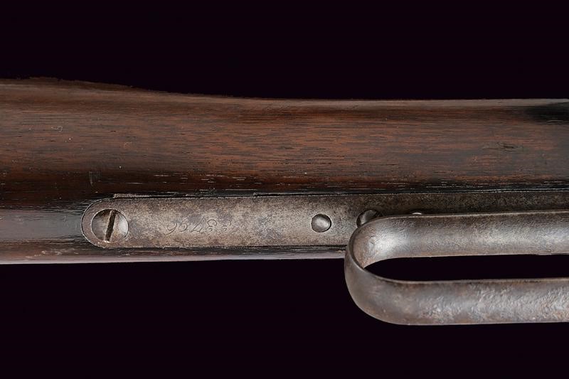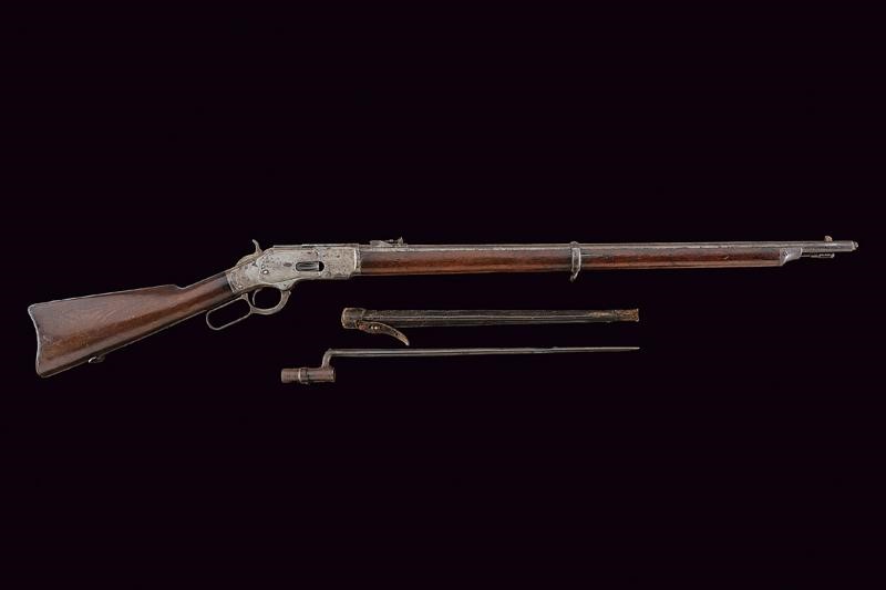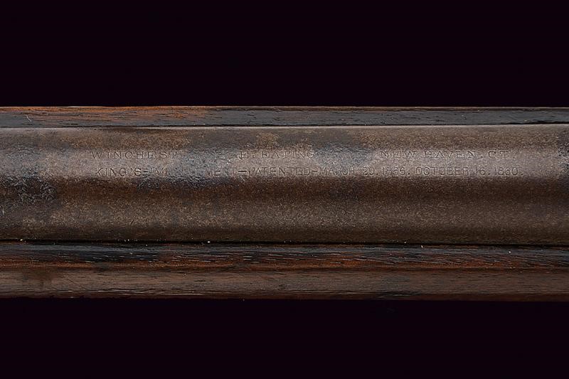 Canna tonda, rigata (pulita e con rigatura appena visibile), con indirizzo Winchester, King's Improvement e brevetti, con alzo abbattibile e regolabile e mirino, piccole zone con danni da ruggine, cal. 44-40 (o 43 Spanish). Castello liscio con zone di pitting e danni da ruggine, codetta con dicitura del modello, matricola "337xx". Lo sportellino dorsale con piccola zigrinatura ovale. Calcio ed astina in legno, la bacchetta in ferro sul lato sinistro, un solo reggicanna. Completo della sua baionetta a ghiera con fodero in cuoio (puntale mancante). Estremamente raro.