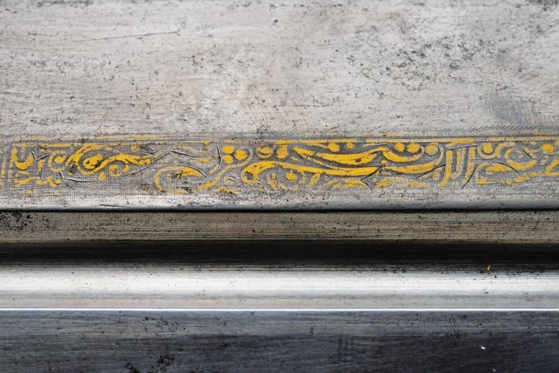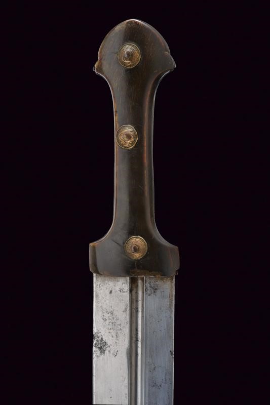 Ampia lama a due fili con scanalature asimmetriche. Su un lato resti di decorazioni in oro. Impugnatura con guancette in corno e rivetti in ottone con resti di doratura. Fodero in legno rivestito di cuoio con fornimenti in ottone.