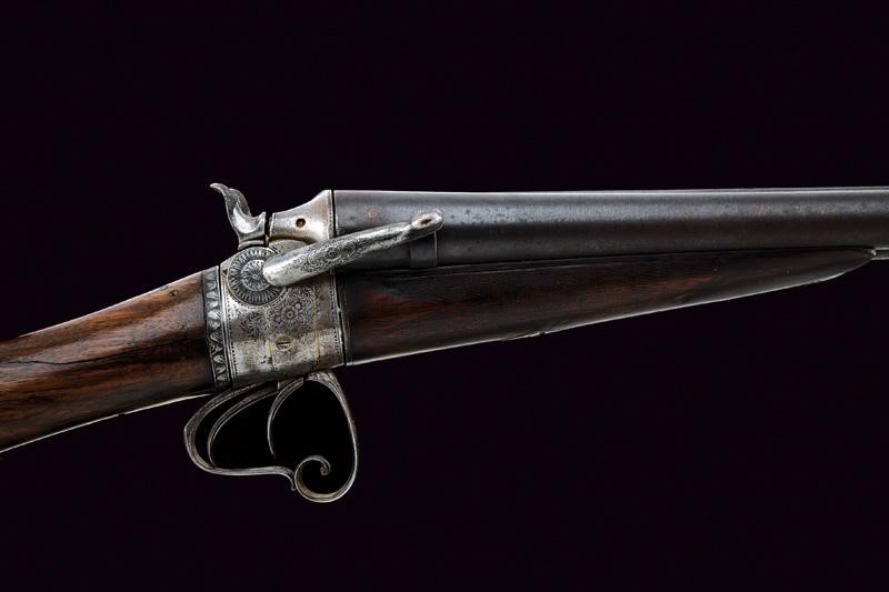 Canne tonde lisce con bindella concava marcata "DAMAS ANGLAIS" in oro, mirino, cal. 12; castello in ferro inciso a motivi floreali, sul lato destro leva per caricare i cani; castello, canne e calcio velocemente svitabili; ponticello in ferro inciso, calcio ed astina in legno. Interessante sistema. In patina.