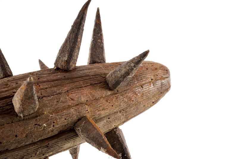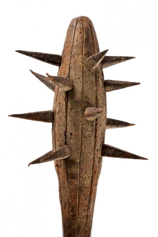 La testa ovale lavorata in un solo pezzo con il fusto, il manico ingrossato. La testa con robuste cuspidi appuntite di sezione quadra con angoli smussati. Il legno decorato con sottili scanalature. Fori di tarlo.
