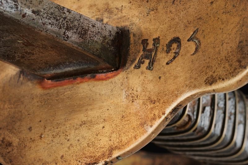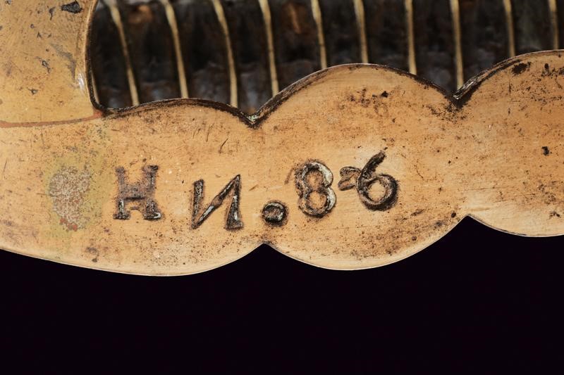 Lama curva a un filo e breve controfilo, sgusciata per quasi tutta la lunghezza, recante alla base tracce di un punzone. Varie evidenti intaccature. Fornimento in ottone con ampio elso a coccia recante resti di una marcatura non chiaramente leggibile e timbro "H93". Guardia a due rami, il terzo mancante, quello principale timbrato "HN.86". Impugnatura di sezione quadra con rivestimento in vecchia manica di cuoio ed avvolgimento in filo d'ottone. Piccoli danni e mancanze, segni d'uso e del tempo. Cappetta corta quadra. Fodero in cuoio (danni e mancanze) con fornimenti in ottone a due campanelle.