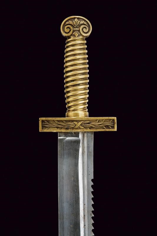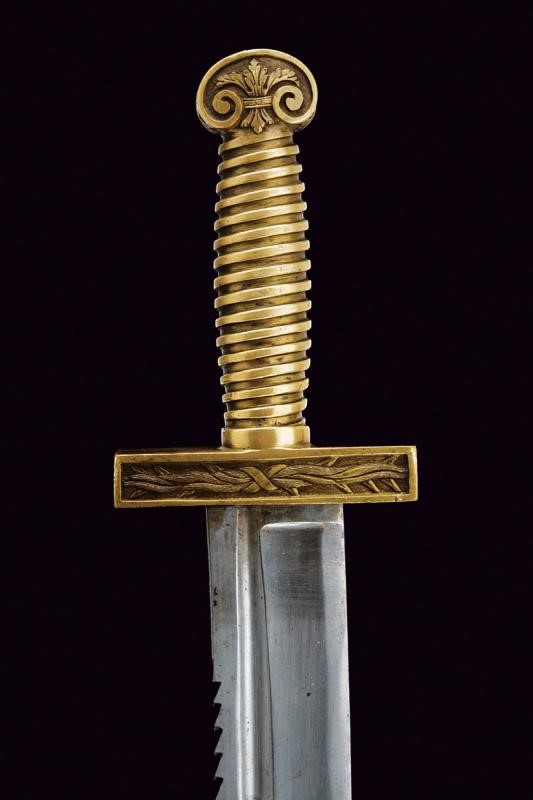 Ampia lama curva a un filo e controfilo con dorso a sega, dotata di sguscio centrale e scanalatura dorsale; il tallone con resti di marca. Fornimento in ottone massiccio con elso dritto di sezione quadra, decorato, come anche il pomo, a motivi floreali in rilievo. Impugnatura a spire. Completa di fodero in cuoio (danni, il puntale si stacca facilmente) con fornimenti in ottone.