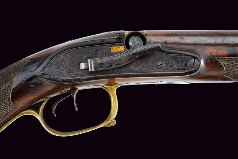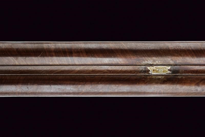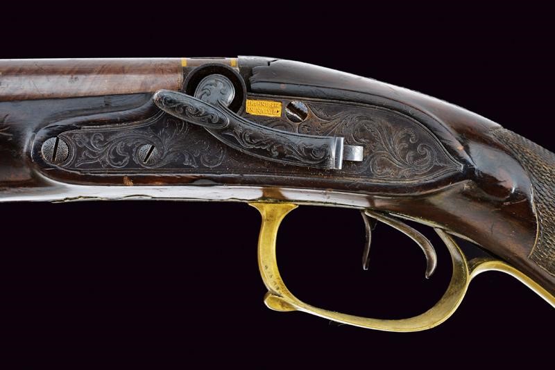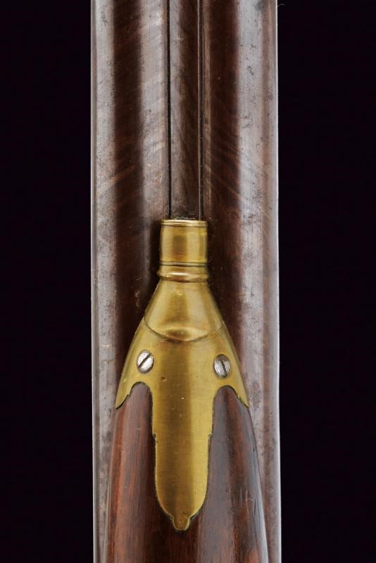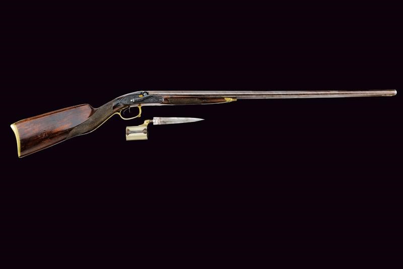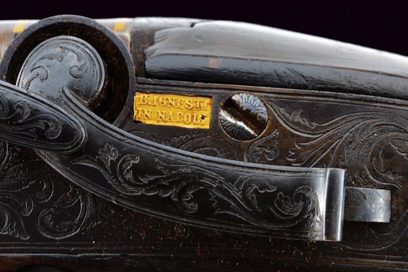 Canne lisce tonde giustapposte brunite e damascate, la base con marchi rimessi in oro "B. IGNESTI IN NAPOLI" tra cornici in oro, bindella con mirino in calibro 18 mm; bella codetta incisa a motivi floreali con traguardo, brunita di nero. Batterie a cartella pitta marcate en suite, finemente incise a motivi floreali e con cani laterali. Mezza cassa in legno (piccolissime mancanze e segni del tempo) con poggiamano e collo zigrinati. Fornimenti lisci in ottone, bacchetta e reggi bacchetta mancanti. Completa della rara baionetta con lama di sezione a losanga e svitabile dal corpo di attacco al fucile in metallo.