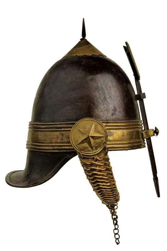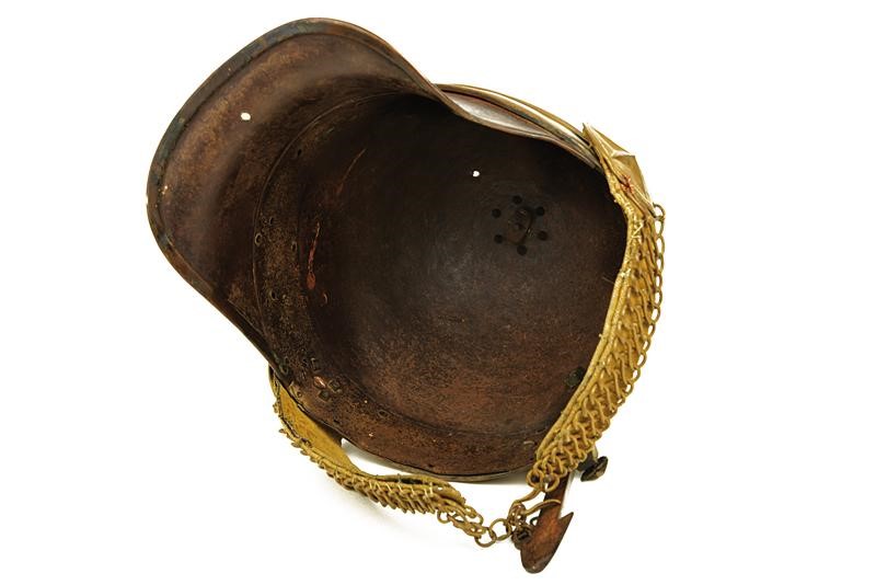 Coppo e lama di gronda in ferro, con fornimenti in ottone, cuspide sommitale a mezzaluna su rosetta conica, bordo inferiore con banda e coccarde a stelle. Completo di soggolo, protezione nasale regolabile raffigurante un freccia; all'interno fori per imbottitura. Fodera mancante. Segni d'uso e del tempo.