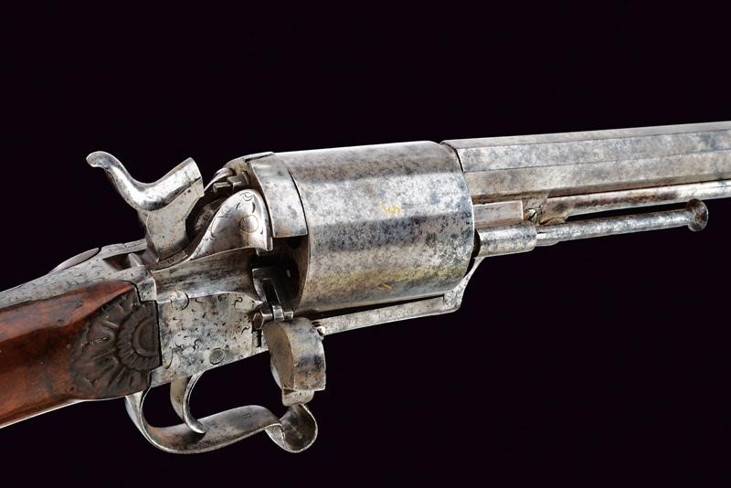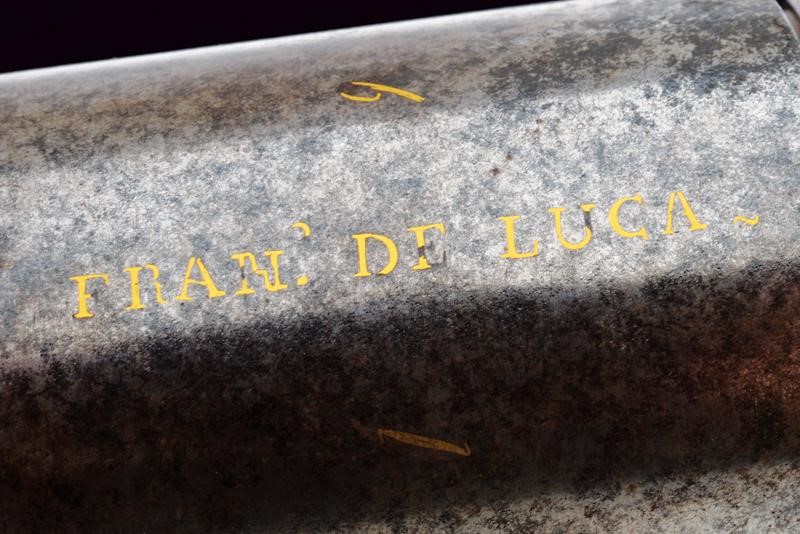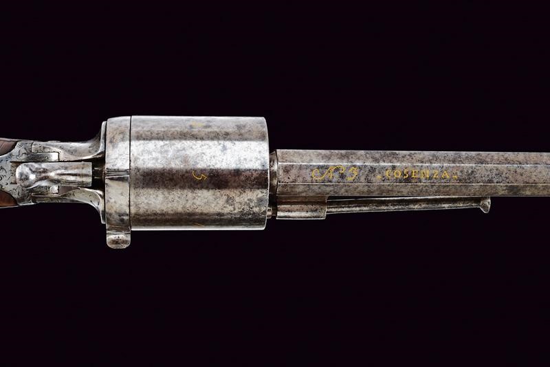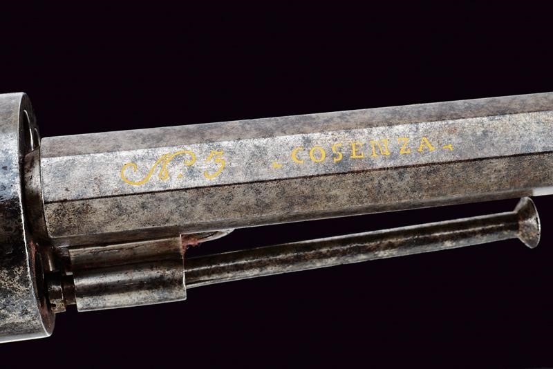 Canna rigata ottagonale, marcata alla base in oro "N. 3" e "COSENZA", munita di mirino, in calibro 11 mm. Tamburo liscio a sei colpi, firmato in oro "FRAN. DE LUCA" e con numerazione delle camere da uno a sei. Sportellino di caricamento ed estrattore. Inoltre è presente il calcatoio, il quale fa pensare che l'arma fosse originariamente a luminello e sia stata poi convertita. Castello marcato su un lato "ETA DI G. VITARI", dall'altro "GIUGNO 1865 FRANCO", riccamente inciso a motivi floreali. I due codoli del castello, il ponticello e il calciolo incisi en suite con il castello stesso. Calcio in legno parzialmente scolpito a motivi floreali con piccoli restauri e danni da tarme. Raro.