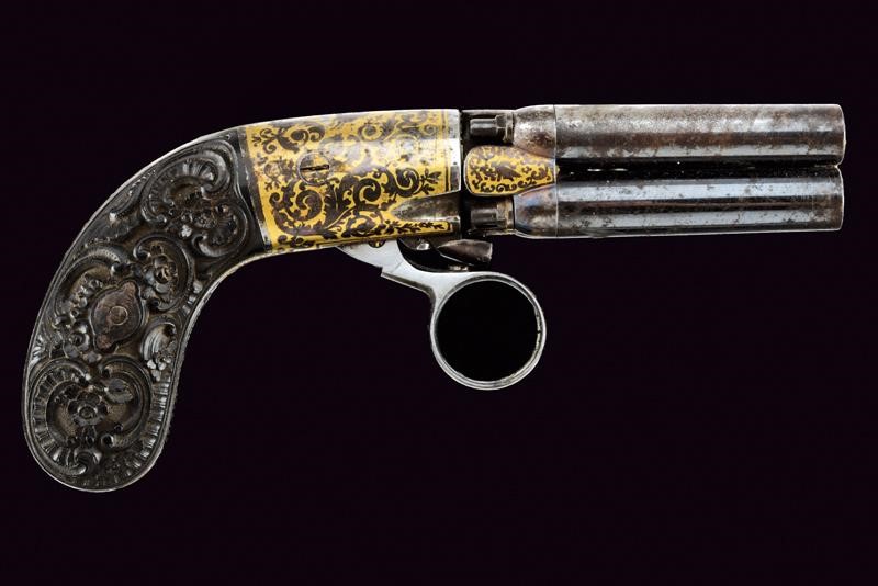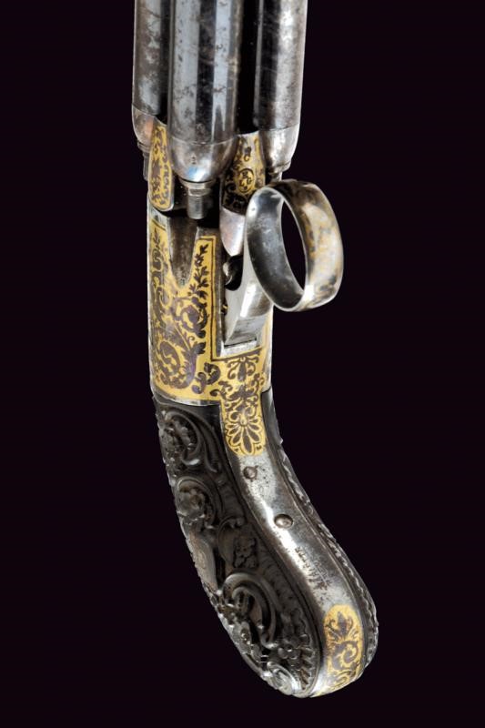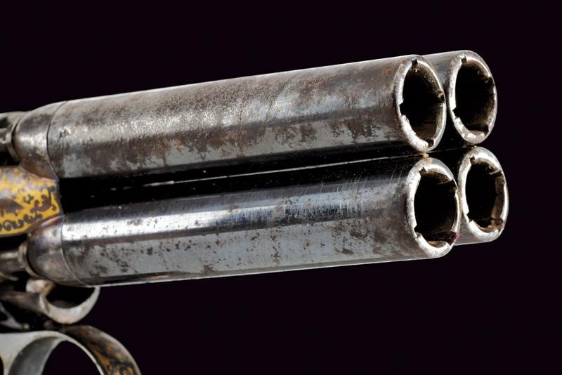 Gruppo di quattro canne tonde, lisce, svitabili con resti di brunitura in calibro 8 mm. Castello di sezione ovale con belle decorazioni floreali su sfondo dorato, al centro un cinghiale, gli spazi alla base delle canne decorati con lo stesso motivo, matricola "56". Impugnatura con guancette in ebano riccamente scolpite a motivi floreali in bassorilievo, il dorso decorato en suite. Cane sul lato inferiore, grilletto ad anello decorato nello stesso modo. In cassetta di legno ricoperta di cuoio e con fornimenti traforati ed incisi in ottone, al centro cartiglio con monogramma "LD". L'interno foderato in velluto bordeaux e munito di fiaschetta, fondipalle, bacchetta e scatolina per le capsule.