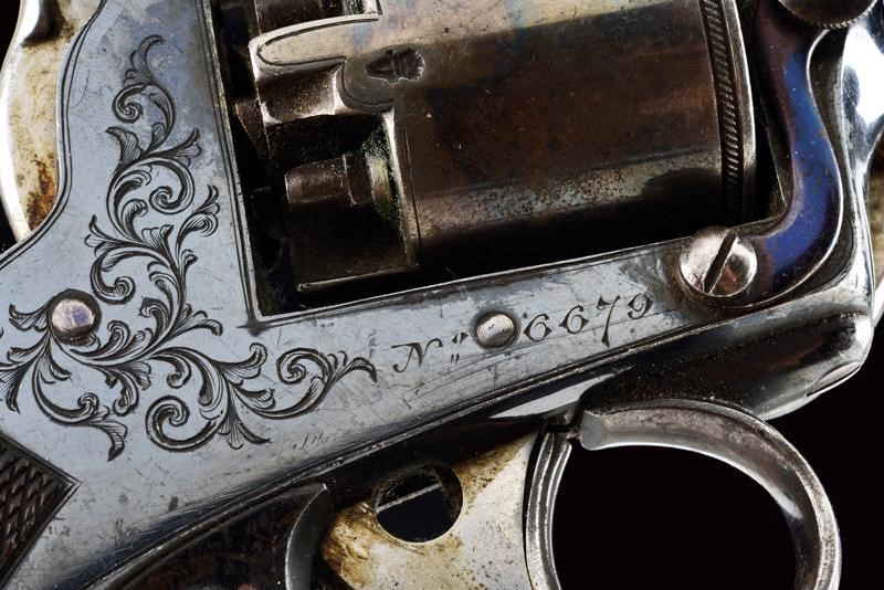 Canna di sezione ottagonale, rigata (rigatura visibile, anima da pulire), dotata di mirino, cal. 9 mm. Dorso con marcatura "Francis Marquis B.te 4 Boulevard des Italiens Paris". Incisioni a racemi. Brunitura antica presente al 70%. Tamburo a sei colpi con resti di tartarugatura, recante punzoni del banco di Londra. Impugnatura in legno zigrinato. Estrattore e grilletto con diciture dei brevetti Tranter. Meccanica funzionante.