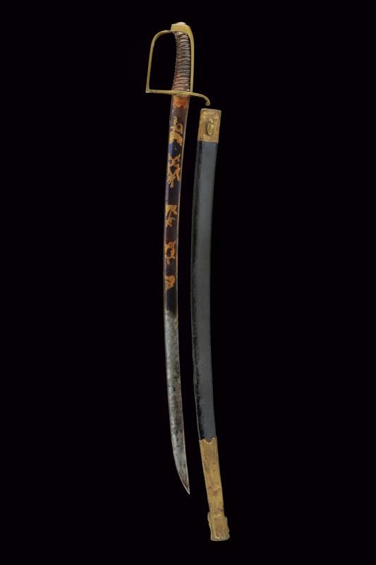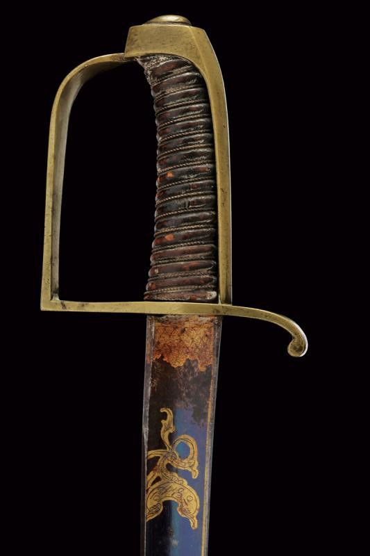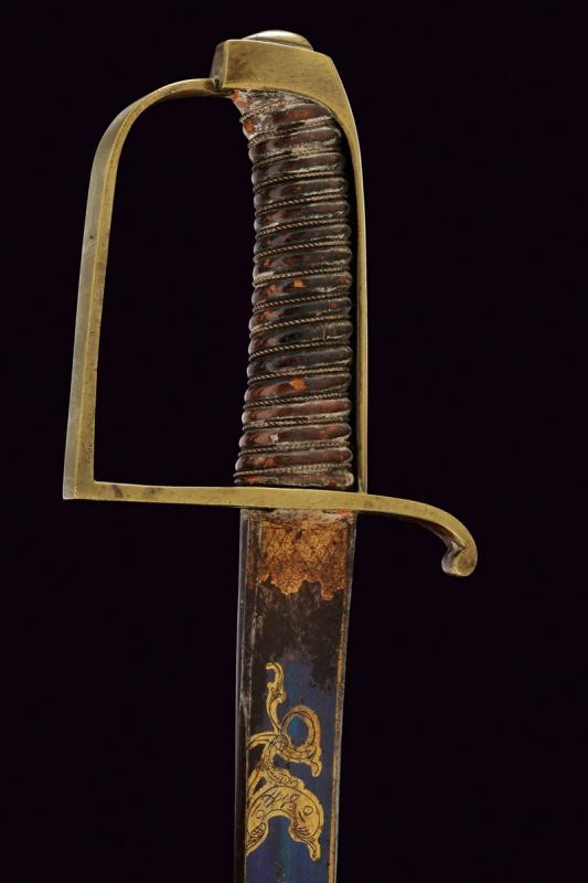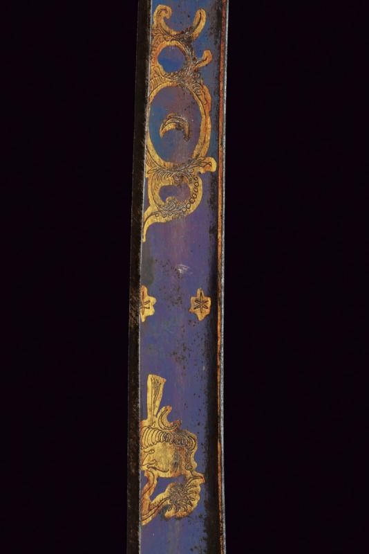 Lama curva a un filo e breve controfilo, probabilmente adattamento d'epoca di una lama più ampia; le facce sgusciate e per metà azzurrate, con incisioni racemi, trofei e a testa di turco, oltre a cartigli con cifre cabalistiche, i disegni dorati. Il tallone con decoro a rete anch'esso dorato. Fornimento in ottone con elso piano, guardia palmata verso l'alto, cappetta lunga a profilo squadrato. Impugnatura con manica di cuoio antica e spirale di trecciola in rame. Fodero in ferro tinto nero (più tardo?) con fornimenti in ottone; la cappa con bottoncino. Probabilmente Epoca Direttorio.
