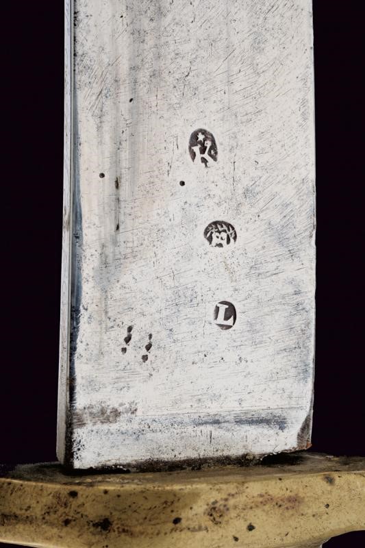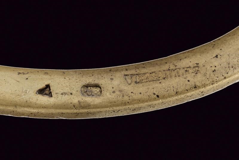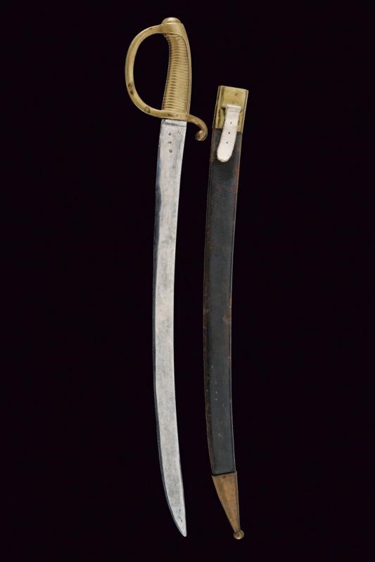 Lama curva a facce piane quasi parallele, a un filo e breve controfilo, punzonata al forte "K" sotto stella, "B" entro allori, e "L" entro un cerchio, recante al dorso marcatura e data "M.f.re Imp.ale du Klingenthal X... 1813". Qualche intaccatura in punta. Fornimento tipico in ottone in un unico pezzo con l'impugnatura. Forse riparazione al codolo. Guardia con resti di punzoni e timbro "VERSAILLES". Fodero in cuoio con fornimenti in ottone. Cappa con passante e laccio in pelle tinta color bianco.