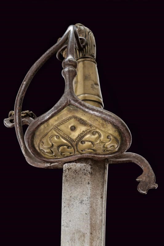 Lama curva a un filo e controfilo con scanalatura dorsale; bel fornimento in ferro ed ottone, elso con bracci a "S", le estremità a testa di leone stilizzata; il bordo della valva, l'anello da pollice e la guardia in ferro; la valva decorata a sbalzo, il pomo intagliato a testa di leone e l'impugnatura liscia con anellatura in ottone al centro. In ottone anche la catenella. Bellissima arma da ufficiale.