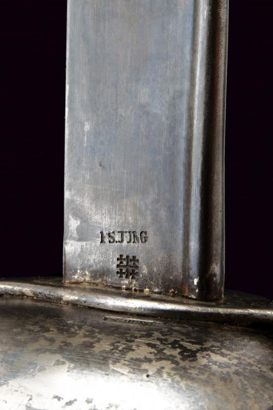 Larga lama a un filo (intaccature) con dorso a bacchetta, la base datata "1858" e marcata "F. S. JUNG" e con un punzone. Fornimento in ferro a due valve, marcato "F. S. JUNG" e "V" e con tre rami di guardia. Impugnatura in legno ricoperta di pelle di pesce e trecciola in ottone. Fodero in legno ricoperto di cuoio con fornimenti in ferro.