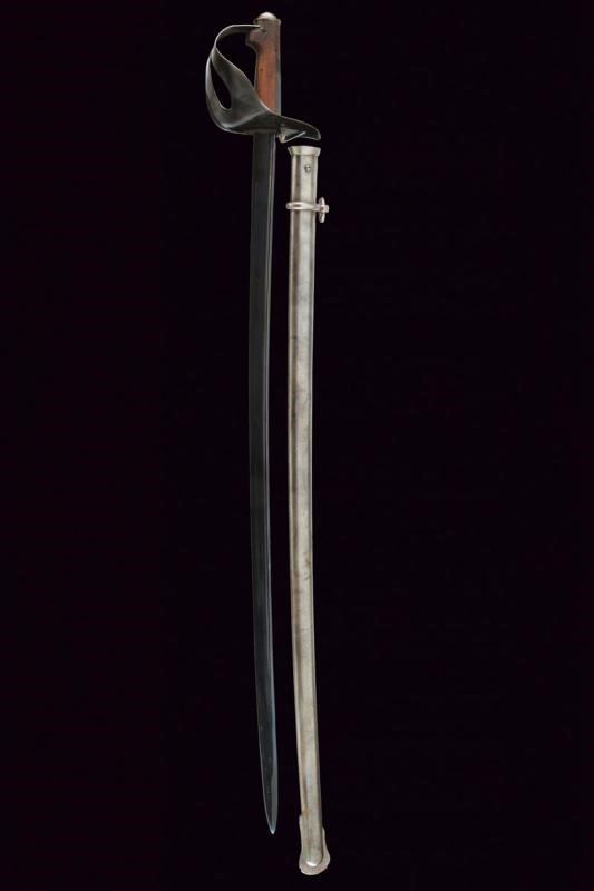 Lama brunita leggermente curva a un filo e controfilo con dorso a bacchetta, la base punzonata sul lato di quarta "MA". Fornimento in ferro marcato due volte "26", anch'esso brunito, grossa vela con singolo traforo a goccia. Impugnatura in legno (alcune mancanze) con cappetta lunga, la parte vicino al pomo intagliata a righe oblique che si intersecano e marcata "A 5530" nelle vicinanze del massello. Completa di fodero in ferro (danni) ad un anello di sospensione.