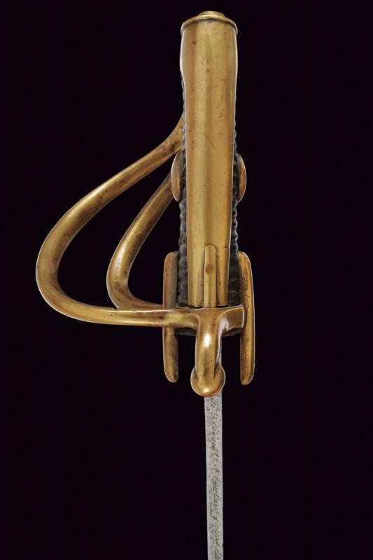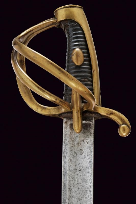 Larga lama curva a un filo e breve controfilo recante ampio sguscio e breve tallone; alla base due punzoni non chiaramente leggibili (un forse "N", l'altro "LW"). Al dorso "M.f.ture du Klingenthal Coulaux Freres Entrep.rs". Fornimento in ottone. Alette fermafodero bombate, guardia a tre rami "a la chasseur" e cappetta lunga. Il ramo di guardia principale timbrato "RJ" sotto corona e con un altro marchio non leggibile. Impugnatura in legno con rivestimento in manico di cuoio (qualche mancanza e difetti) senza trecciola. Fodero in ferro (con varie mancanze e intaccature) a due campanelle.