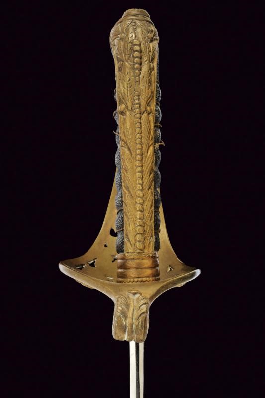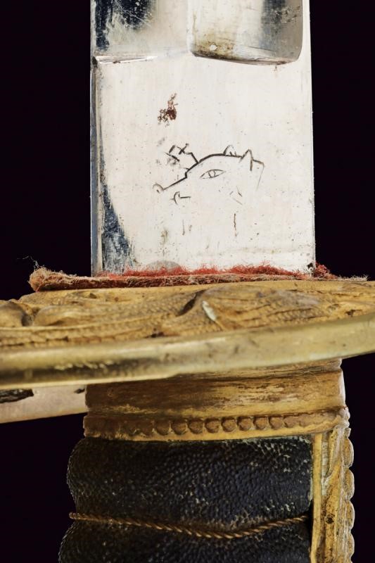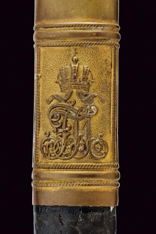 Lama curva sgusciata per due terzi, a un filo, punta e breve controfilo, con tallone munito di resti di marca a cinghiale. Finitura nichelata ben conservata. Fornimento in ottone con resti di doratura. Ampia guardia decorata in rilievo e a traforo con l'aquila bicipite imperiale austriaca attorniata da fiorami. Cappetta lunga con fronde di lauro in rilievo. Impugnatura con rivestimento in pelle di pesce e resti di trecciola metallica. Fodero in ferro con rivestimento di cuoio (danni, segni d'uso e del tempo); fornimenti in ottone a una campanella fissa e un passante. La cappa con il monogramma coronato dell'imperatore "FJ1".