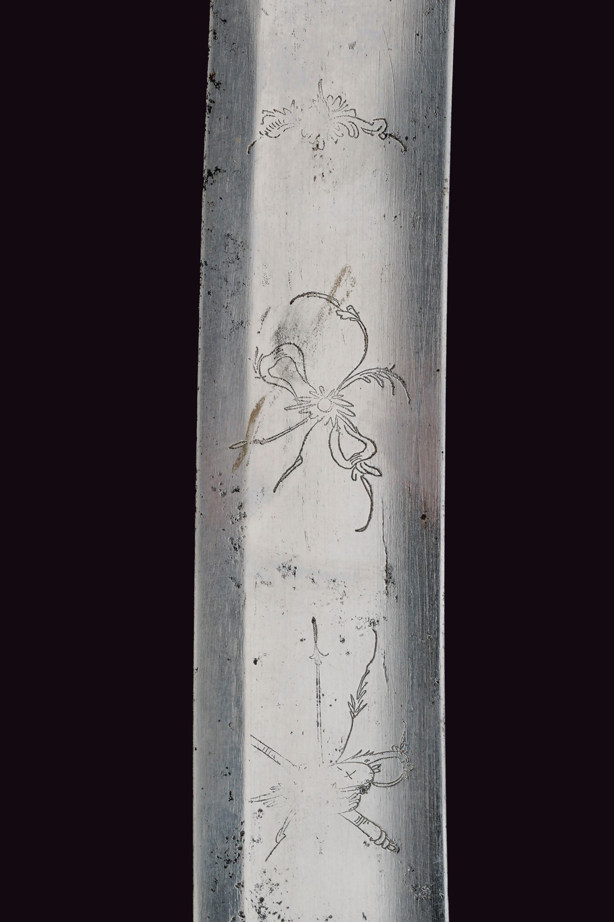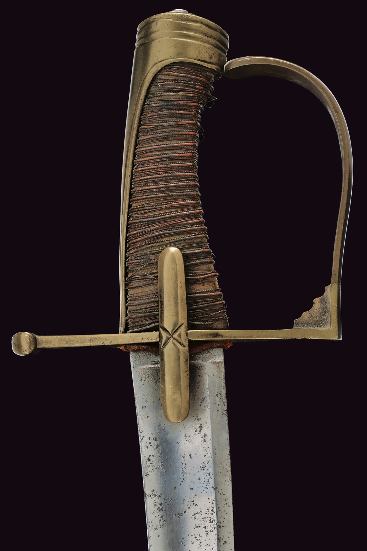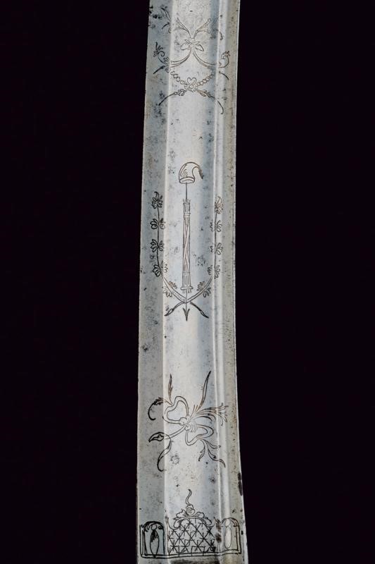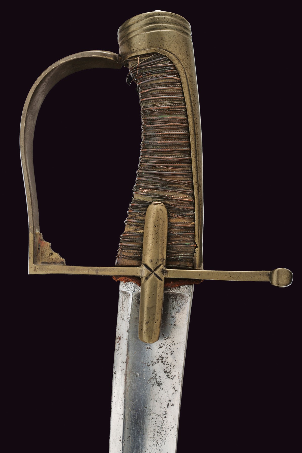 Lama curva a un filo e breve controfilo, sgusciata per quasi tutta la lunghezza, con breve tallone. Intaccature, segni d'uso e del tempo. Al dorso la firma "Peter Willhelm Knecht Fabriquant in Solingen". Larghezza alla base 3,7 cm. Lunghezza circa 78 cm. Fornimento in ottone. Guardia a staffa (riparazione probabilmente realizzata in epoca d'uso) palmata verso l'alto. Alette fermafodero con incisione a "X" al centro, braccio di parata dritto. Cappetta lunga delineata. Impugnatura in legno con resti di trecciole in rame. Priva di fodero.
