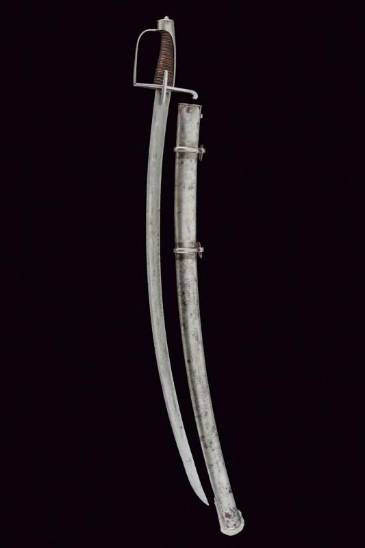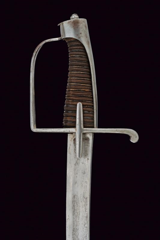 Lama curva, sgusciata, a un filo e breve controfilo, con intaccature, segni d'uso e del tempo. Fornimento in acciaio. Guardia a staffa rastremata verso l'alto. Il braccio di parata dritto e lobato in testa, le alette fermafodero sottili e bombate. Cappetta lunga liscia con piccola cusipide. Bottoncino e orlo del codolo probabilmente riparati. Impugnatura antica in legno con resti di manico di cuoio, cordino e trecciole in rame. Fodero in ferro a due campanelle, anche questo con segni d'uso e del tempo. Francia o Regno Italico.