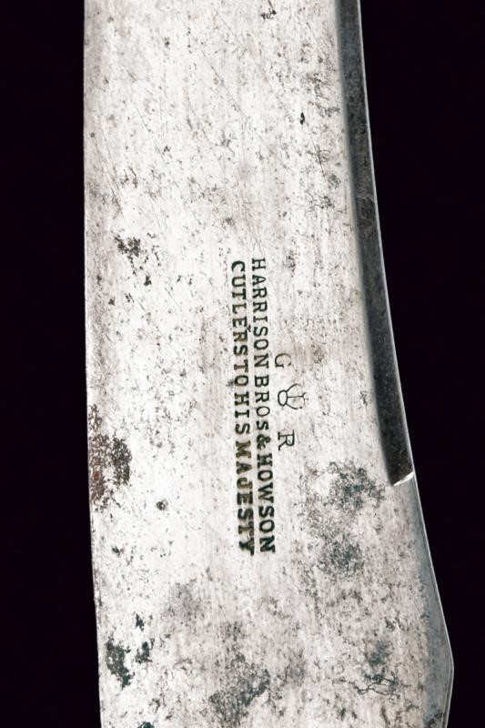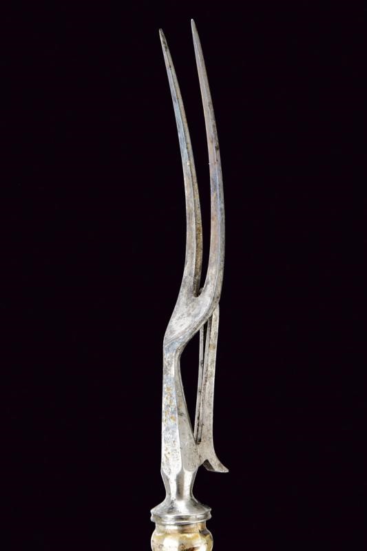 Astuccio rettangolare in marocchino verde scuro con profilatura in oro contenente un bel set per arrosti. Coltello con lama marcata "Harrison Bros & Howson - Cutlers to His Majesty"; forchettone con fermo e attrezzo per affilare. Le impugnature in corno di cervo con bei fornimenti in argento a "Rocailles". Gli argenti con marche e bolli.