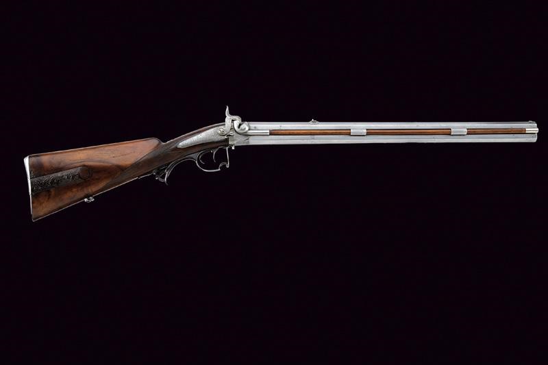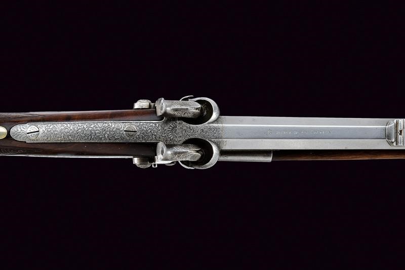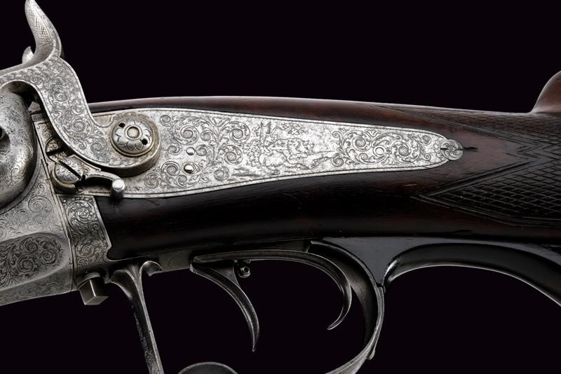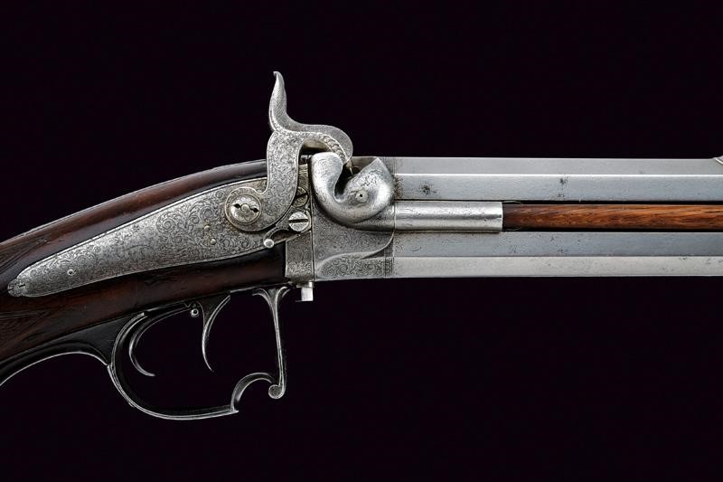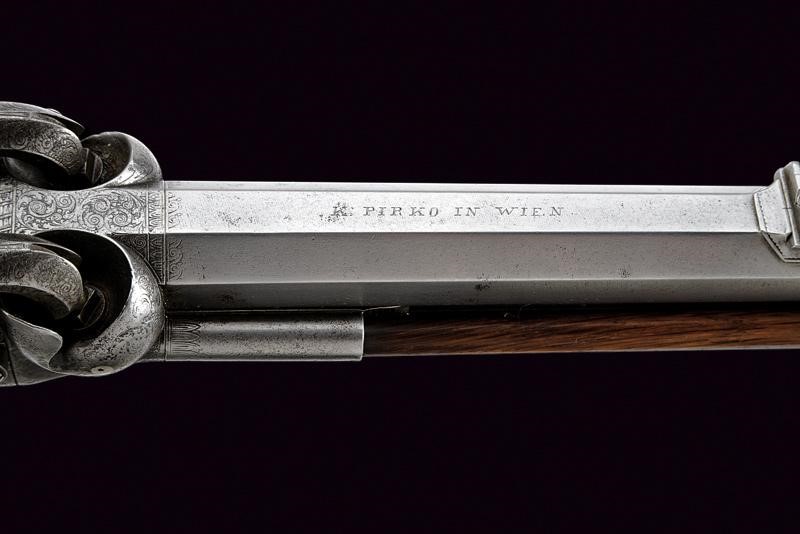 A due canne sovrapposte ottagonali rigate, la base finemente incisa a motivi floreali e con incisione del fabbricante "K. PIRKO IN WIEN". La canna superiore munita di alzo regolabile e mirino, quella inferiore marcata "1", cal. 15 mm (entrambe). Lunga codetta incisa en suite con la base. Batterie a molla indietro firmate sotto il cane, una "PIRKO" e l'altra "WIEN", entrambe finemente incise a motivi floreali e temi venatori, i cani con decorazioni en suite muniti di sicura. Calcio in legno con collo zigrinato e dorso con scudetto in argento, patchbox con finestra scorrevole scolpita a fogliame; fornimenti in ferro ornati en suite, il ponticello allungato con una struttura in ebano. Uno dei due grilletti con stecher. Bacchetta laterale in legno con battipalla in metallo.