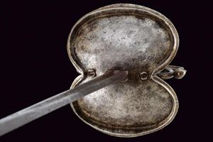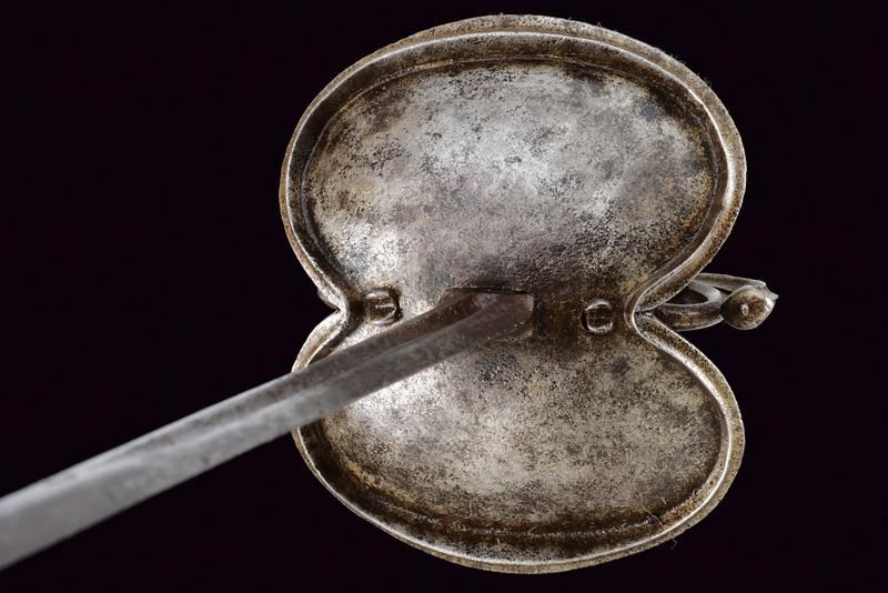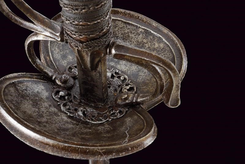 Lama dritta a due fili, profondamente scanalata al forte, con un piccolissimo danno da traforo al centro. Fornimento in ferro a due valve convesse e munite di alto bordo nervato; interessante contrococcia intagliata e traforata con due volatili fra decorazioni floreali; bracci dell'elso e ramo di guardia lavorati en suite con il bordo delle valve; pomo con profonde scanalature verticali. Impugnatura in legno con resti di rivestimento in pelle, trecciola e teste di moro in fil di ferro.