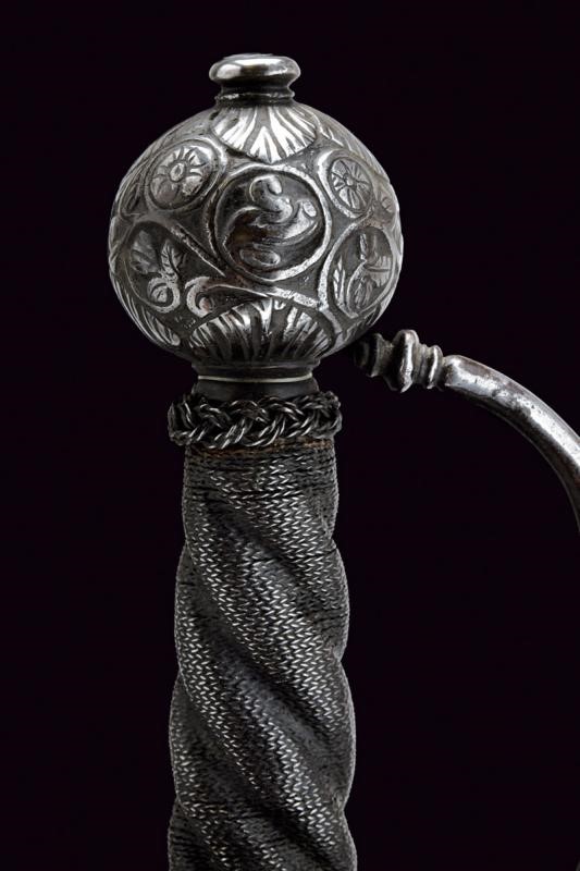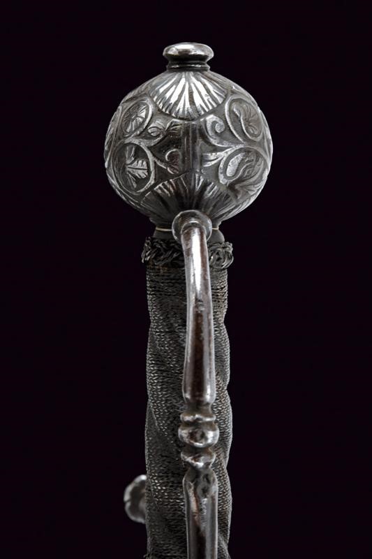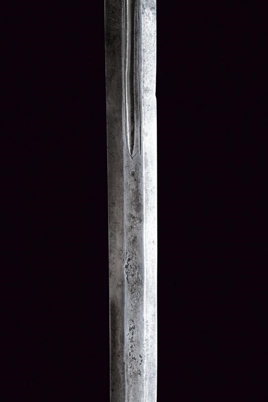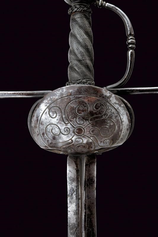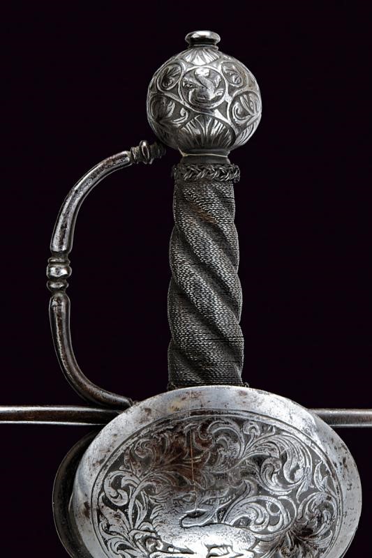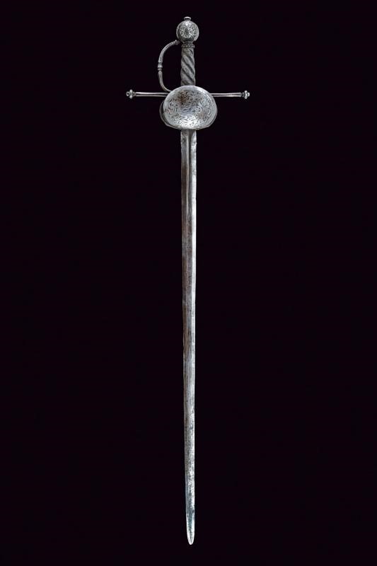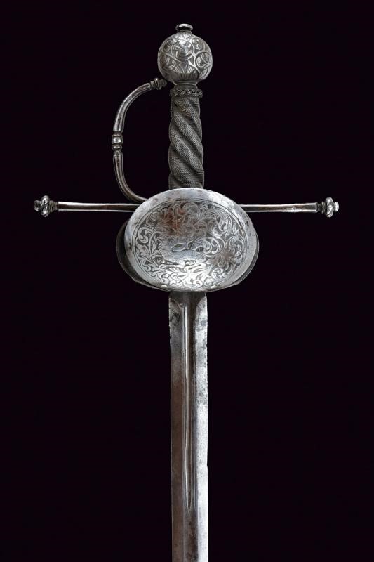 Lama dritta a due fili di sezione esagonale con scanalatura nella prima parte delineata ai bordi. Fornimento in ferro con due valve ovali e convesse, quella anteriore incisa con un drago fra decori floreali, quella posteriore a riccioli che formano un fiore. Zone con danni da ruggine. Bracci dell'elso dritti, di sezione tonda, con germogli alle estremità. Il ramo di guardia decorato a nodi. Pomo ovale intagliato a motivi floreali e con piccoli draghi in bassorilievo. Impugnatura in legno a spire con trecciola e teste di moro in filo di ferro.