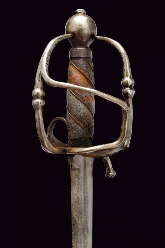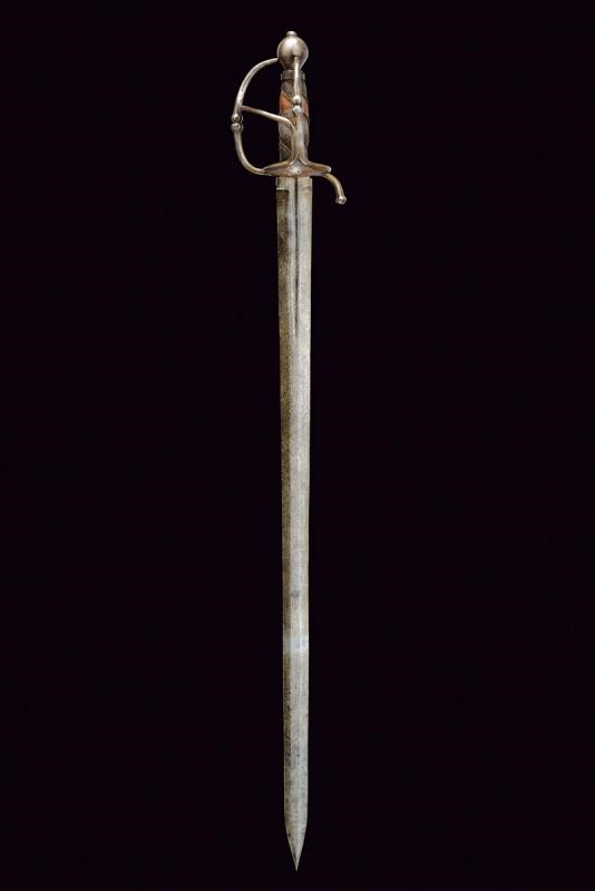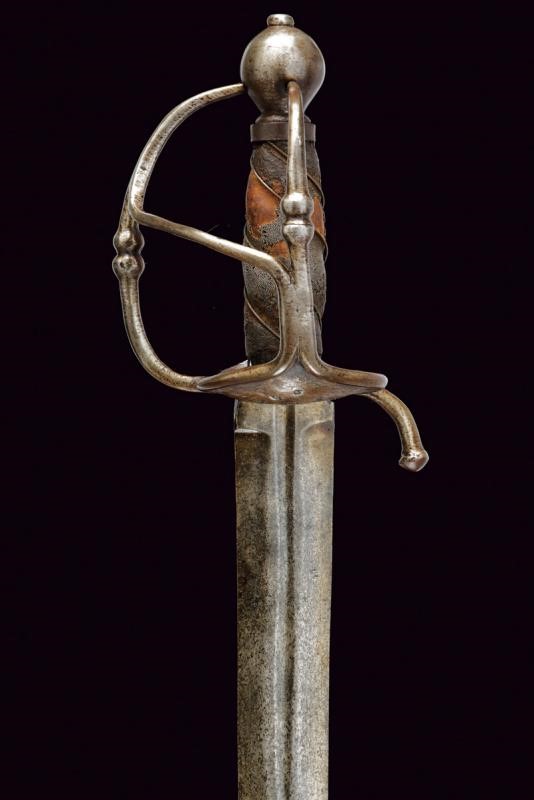 Lama di media larghezza, dritta, a due fili, di sezione esagonale con scanalatura centrale alla base e tallone. Fornimento in ferro con valva anteriore a forma di cuore e traforata, la piccola valva posteriore con anello da pollice, due rami di guardia decorati con doppie sfere e congiunti da un ramo obliquo; pomo sferico. Impugnatura in legno con resti di rivestimenti di pelle di pesce e spirale metallica.