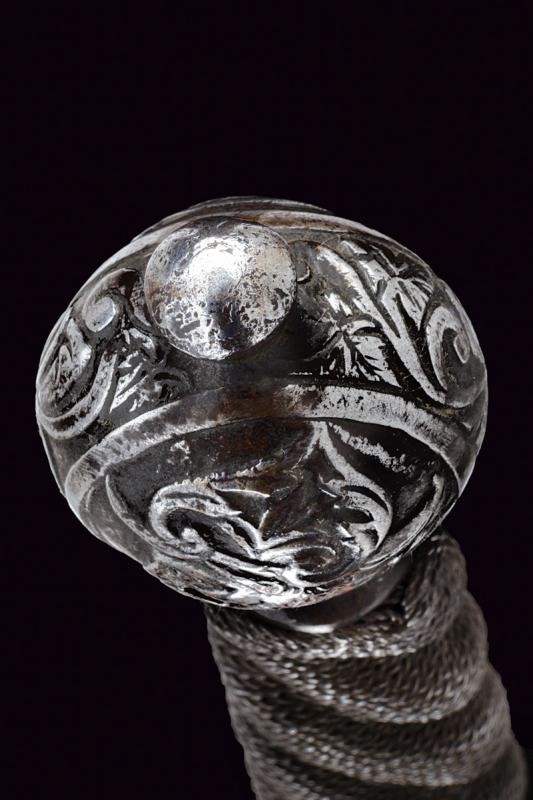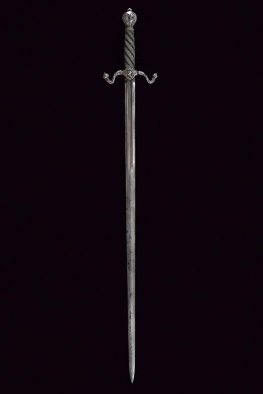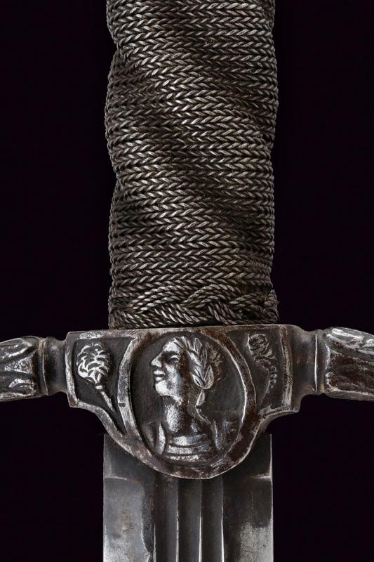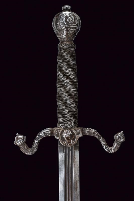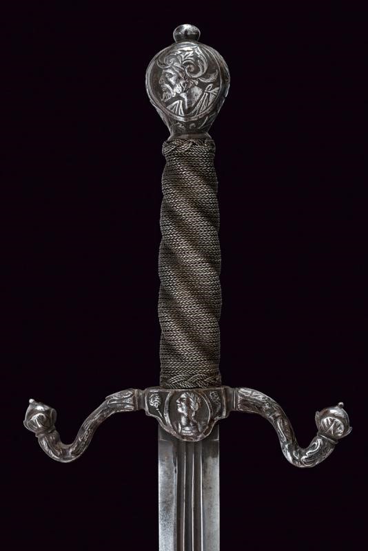 Lama dritta a due fili, di sezione lenticolare; la base con triplice scanalatura. Interessante fornimento con rami dell'elso lavorati a "W", intagliati a motivi floreali con estremità a germoglio. Il massello intagliato con ritratto di un Cesare. Pomo con volto barbuto cinto d'elmo fra decori floreali. Impugnatura in legno a spire con trecciola e teste di moro in filo di ferro.