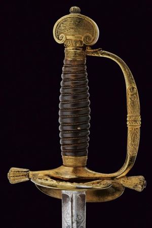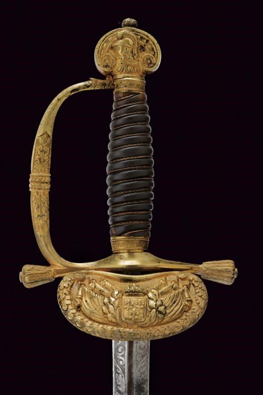 Bella lama dritta a due fili costolata in mezzeria, la prima parte scanalata e finemente incisa a trofei e motivi floreali. Il fornimento in ottone con pelta recante lo stemma a tre gigli sotto corona su bandiere; largo pomo con testa da corazziere fra motivi floreali; impugnatura in corno a spire con trecciola metallica. Fodero in cuoio con fornimenti in ottone.