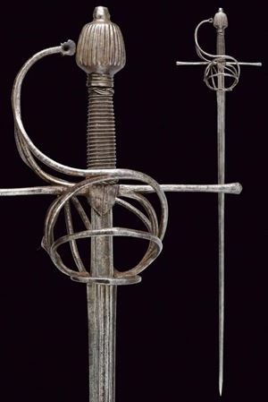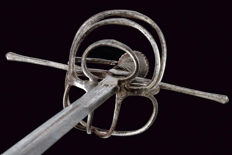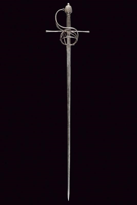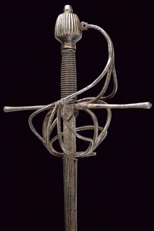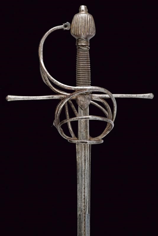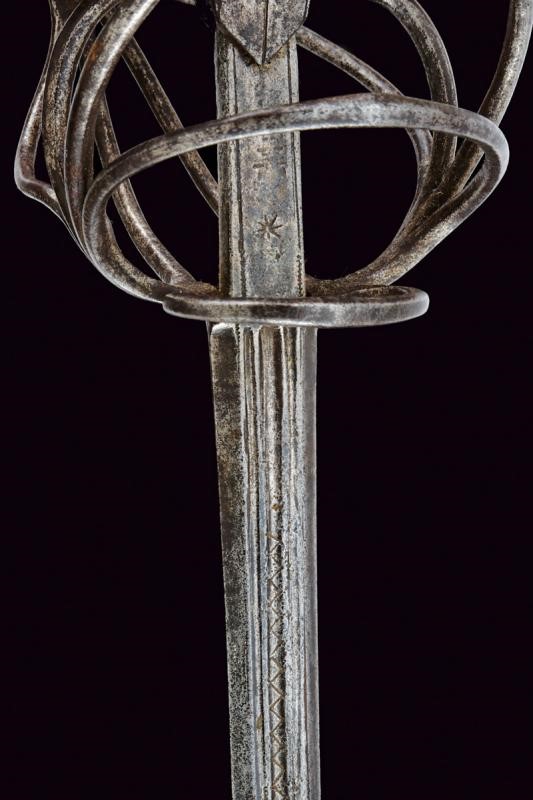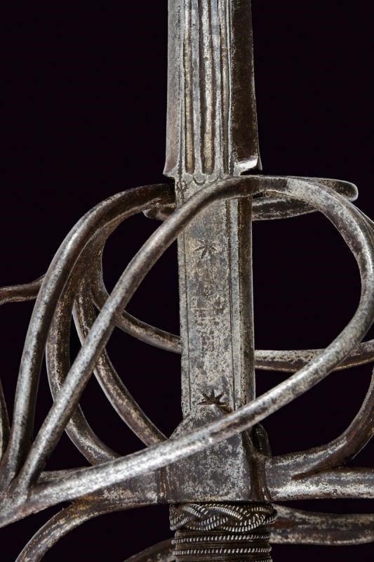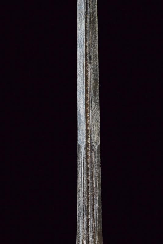 Lunga lama dritta a due fili, con tre scanalature alla base, quella centrale prolungata e decorata con una successione di triangoli; ricasso con resti di punzone fra due stelle e bordi delineati. Fornimento in ferro con massello cuspidato. I bracci dell'elso, i ponti e rami di guardia di sezione tonda, il pomo con scanalature verticali. Impugnatura in legno con trecciola e teste di moro in fil di ferro.