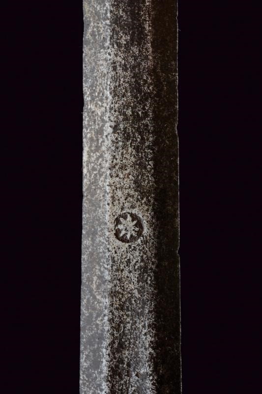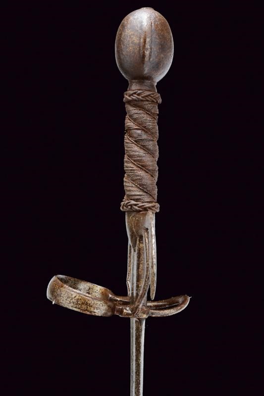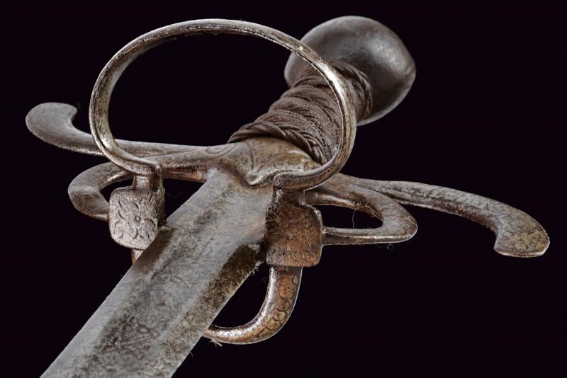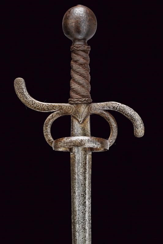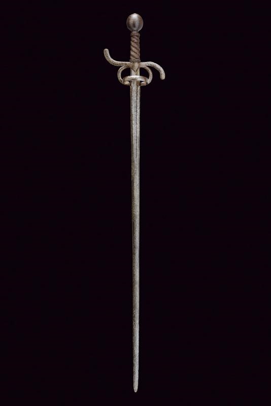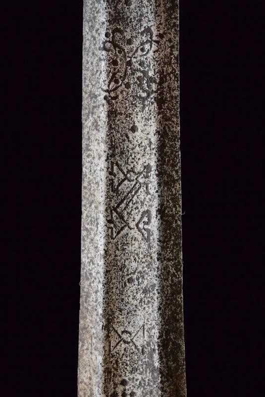 Lama dritta a due fili di sezione esagonale, con sguscio al forte recante simboli cabalistici ed un punzone a stella entro un cerchio su fondo nero, il ricasso sgusciato. Fornimento in ferro con elso a "S", massello cuspidato e ponticello con archetti; il tutto decorato con incisioni floreali. Pomo sferoide leggermente schiacciato. Impugnatura in legno con trecciola e teste di moro in fil di ferro.