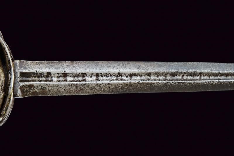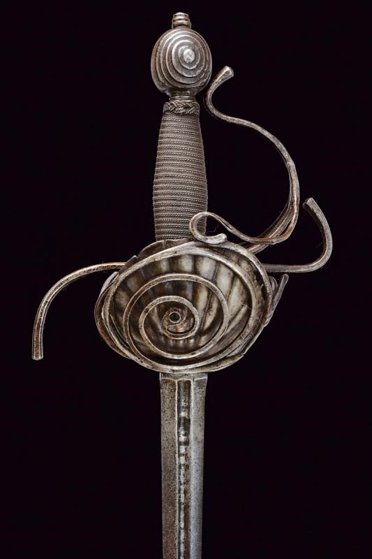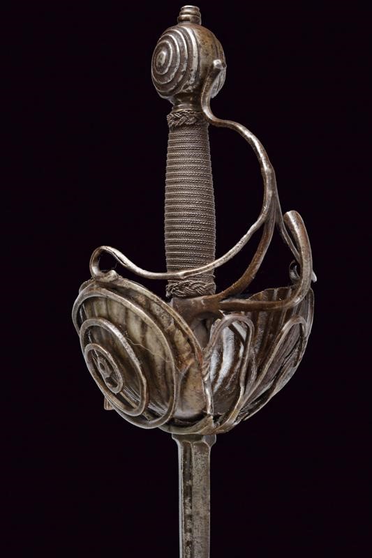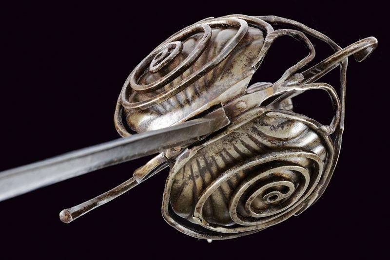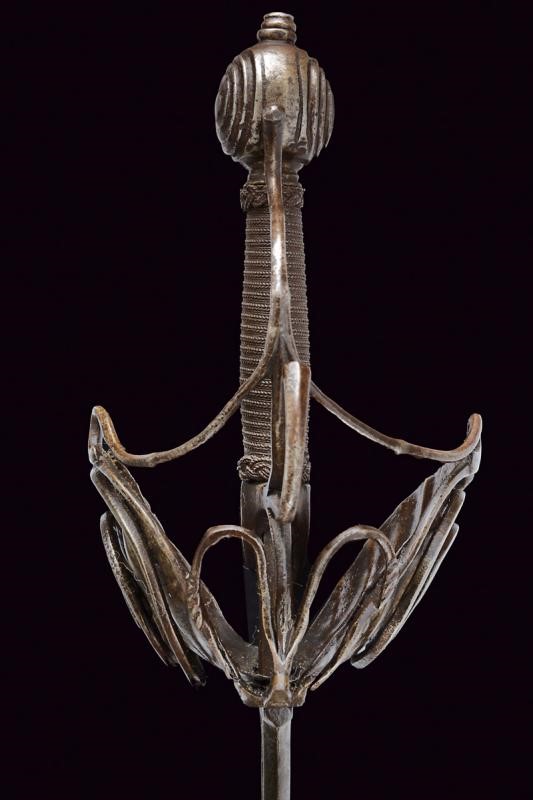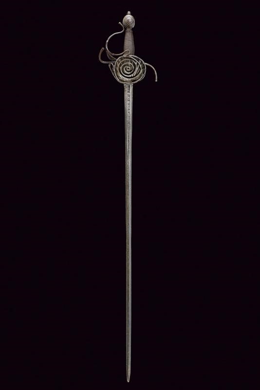 Lama dritta a due fili di sezione a losanga; la prima parte con profonda scanalatura centrale recante resti di iscrizioni poco leggibili. Fornimento in ferro (piccolissimi restauri), due valve a conchiglia decorate nella parte esterna da una spirale in ferro, bracci dell'elso a "S", tre rami di guardia. Le due valve, da un lato, unite con sottili rami a forma di cuore. Pomo ovale con intaglio a spirale. Impugnatura in legno rivestita con trecciola e dotata di teste di moro in filo di ferro.