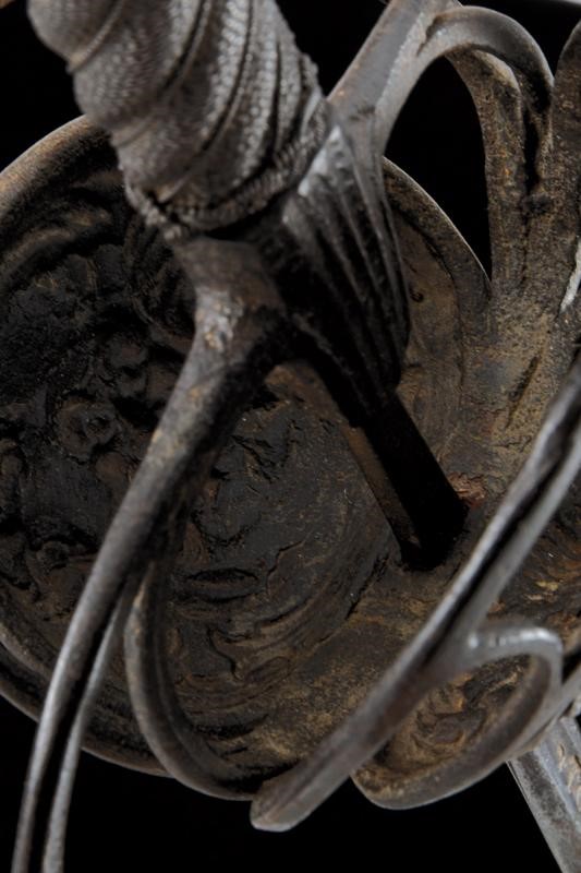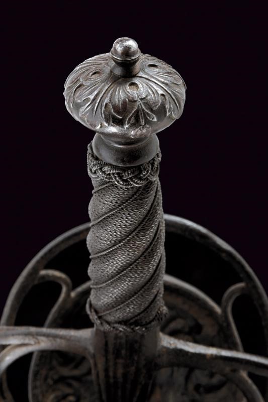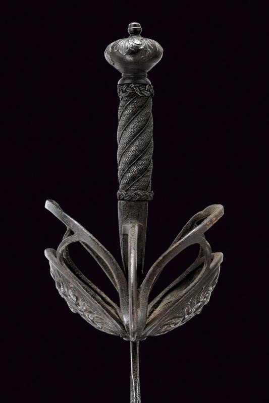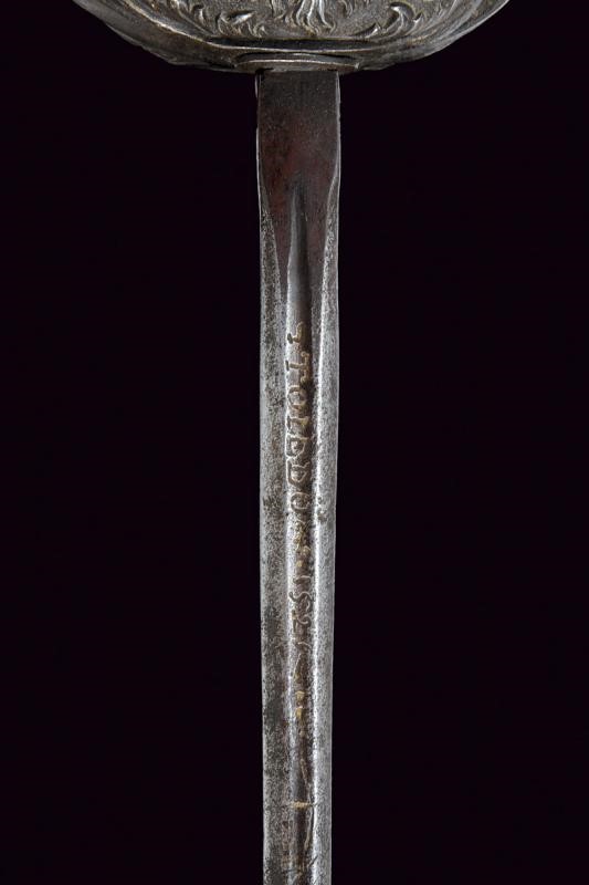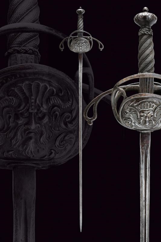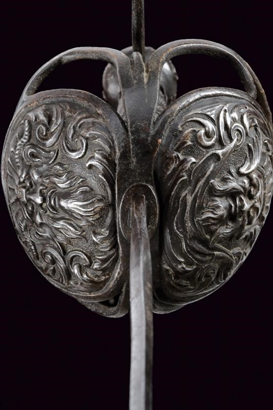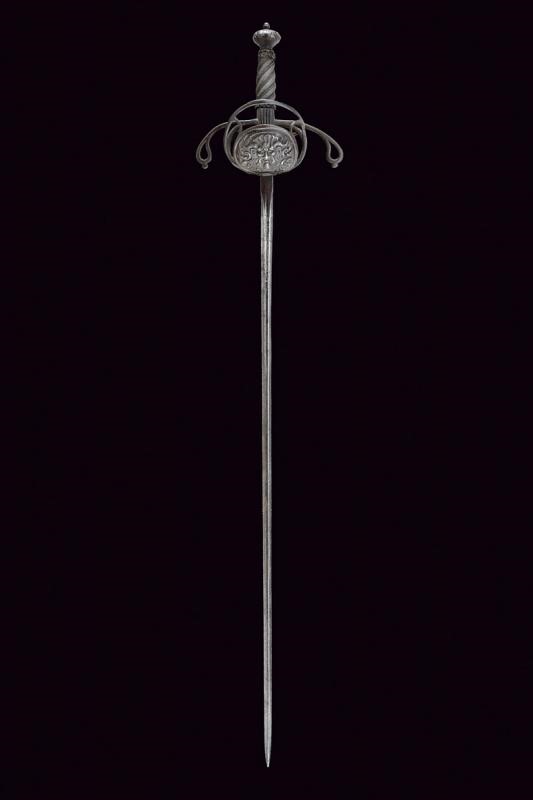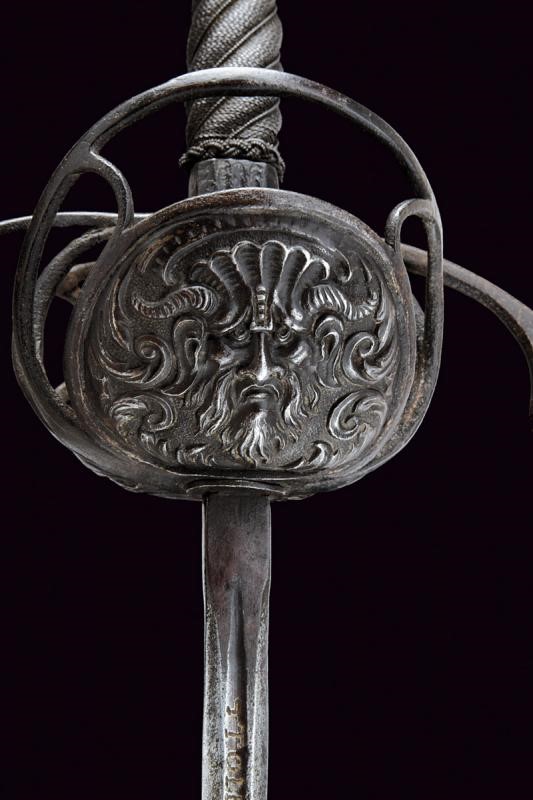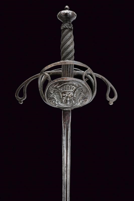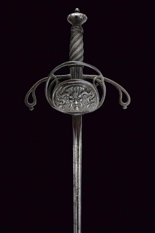 Sottile lama a due fili con scanalatura alla base recante l'iscrizione "TOLEDO", tallone. Interessante fornimento in ferro a due valve che mostrano altrettanti aspetti, ovvero il Bene e del Male: la valva anteriore con un mascherone di un volto barbuto e sorridente e con ali stilizzate, la controparte posteriore con volto barbuto e maligno, munito di corna, entrambe in rilievo. Ciascuna delle due valve è incassata in un ponte di parata; i bracci dell'elso incurvati verso la lama, traforati a goccia e con bottone in testa. Il massello con scanalature longitudinali. Il pomo a corona intagliato a fogliame. Impugnatura in legno a spire con trecciola e teste di moro in filo di ferro.