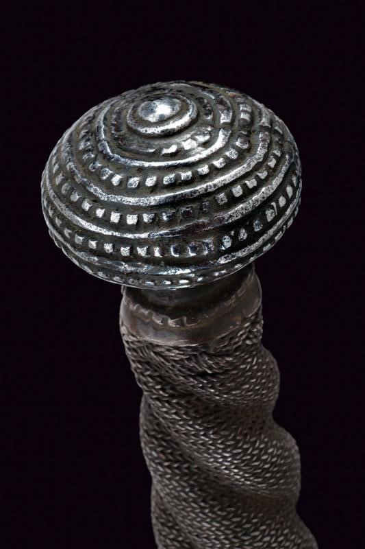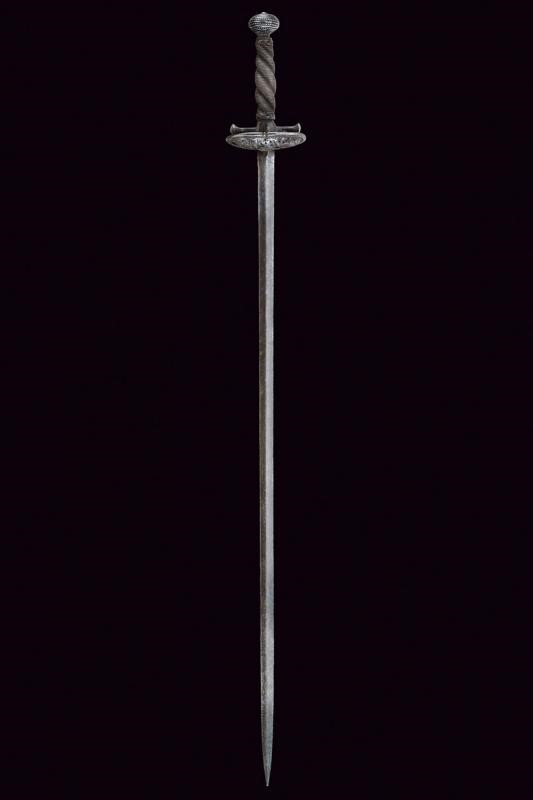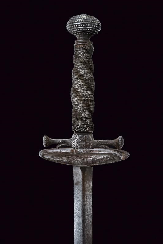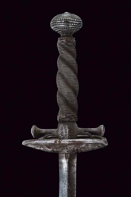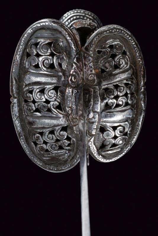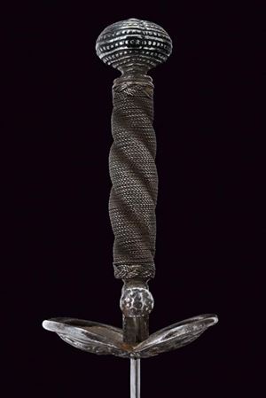 Lama dritta a due fili, di sezione lenticolare. Fornimento in ferro intagliato, la doppia valva traforata ed incisa, corti bracci dell'elso di sezione quadra con estremità ingrossate ed decorate a piccoli cerchi come anche il massello. Due archetti. Pomo sferoide schiacciato, decorato a bande perlinate. Impugnatura in legno a spire con trecciola e teste di moro in filo di ferro.