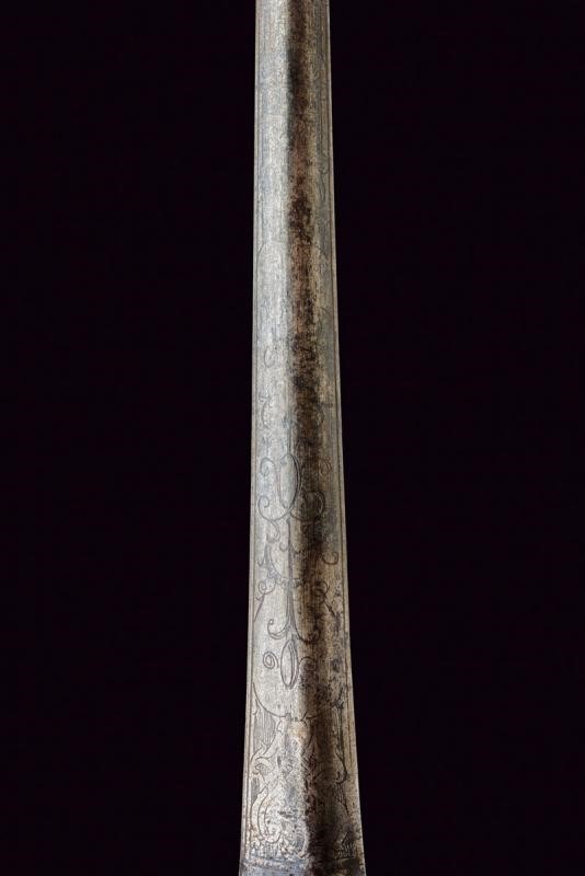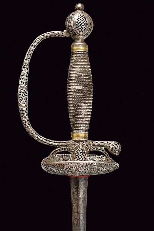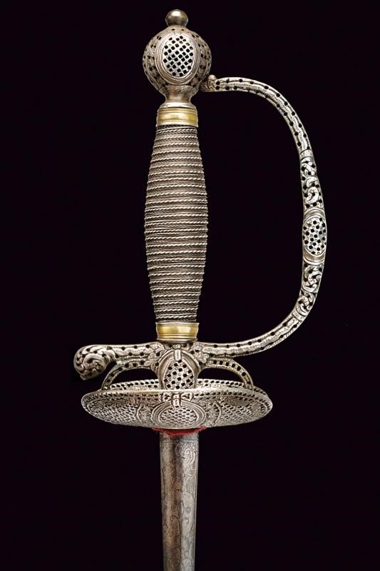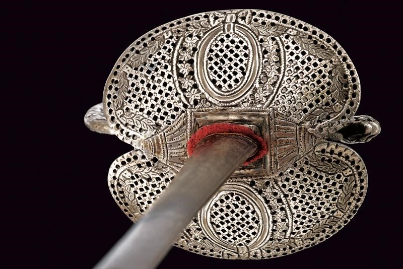 Lama dritta di sezione a losanga, la base esagonale e con resti di incisioni. Bel fornimento in argento riccamente traforato ed inciso a motivi geometrici e floreali, con doppia valva, archetti, braccio dell'elso, ramo di guardia e pomo. Impugnatura in legno, rivestita con filo d'argento e munita di ghiere scanalate e parzialmente dorate.