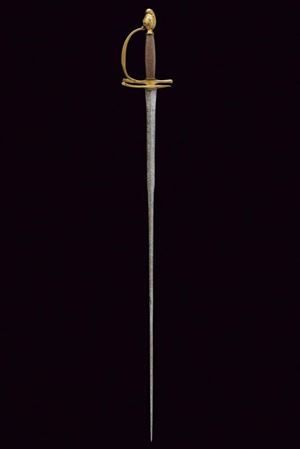 Lama dritta a frantopino di sezione a losanga, ingrossata e incisa a motivi floreali nella prima parte, con base marcata "De La Manufacture De La Marque au Raism Saite a Sohlingen" su entrambi i lati. Fornimento in bronzo con coccia a cuore, pomo con elmo piumato, impugnatura in legno rivestita con trecciola e dotata di una sola testa di moro (l'altra, quella superiore, mancante) in fil di rame.