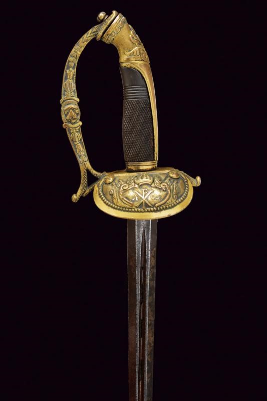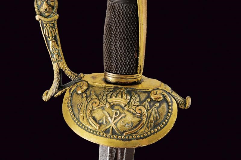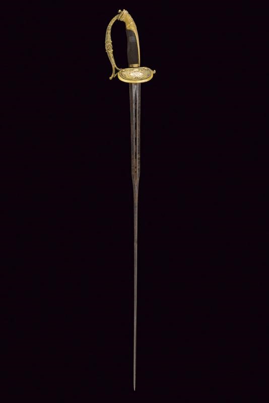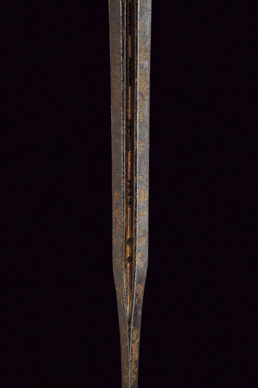 Bella lama a frantopino, allargata al forte, profondamente scanalata e traforata, decorata a trofei e motivi floreali con resti di doratura, su rimanenze di fondo brunito; verso il debole di sezione a losanga. Fornimento in bronzo dorato (parzialmente abraso), la pelta con insegna dell'ordine Costantiniano di San Giorgio sotto corona e fra bandiere. Ramo di guardia con testa di leone al centro, cappetta lunga, impugnatura in corno zigrinato. Molto raro.